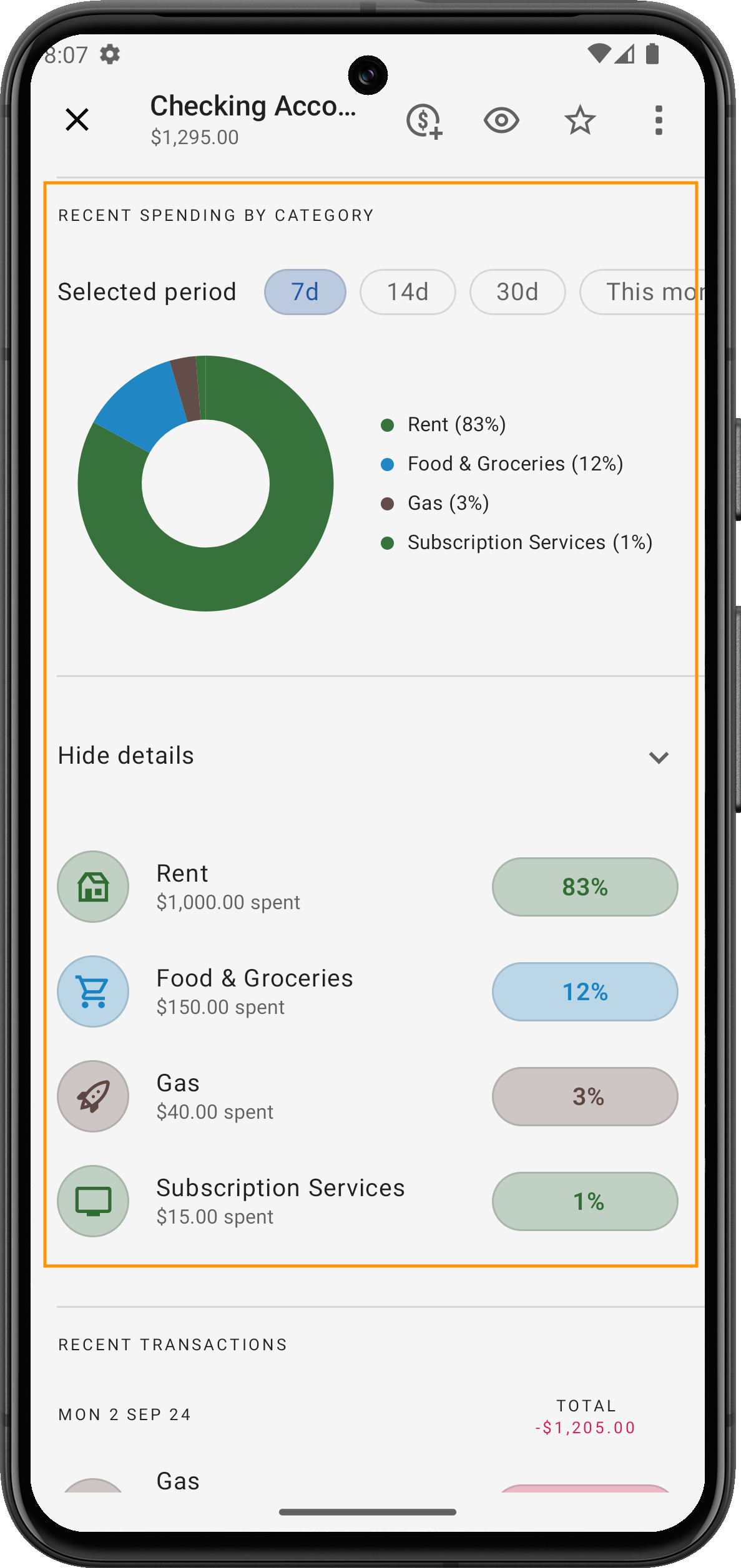 Der Abschnitt Kürzliche Ausgaben nach Kategorie bietet eine visuelle Zusammenfassung, wie Ihr Geld in einem bestimmten Konto ausgegeben wird, und zeigt eine Aufschlüsselung der Kategorien sowie deren prozentualen Anteil an den Gesamtausgaben. Dieser Bereich hilft Ihnen, nachzuverfolgen, wohin Ihr Geld fließt, und ermöglicht es Ihnen, Ihr Budget entsprechend anzupassen.