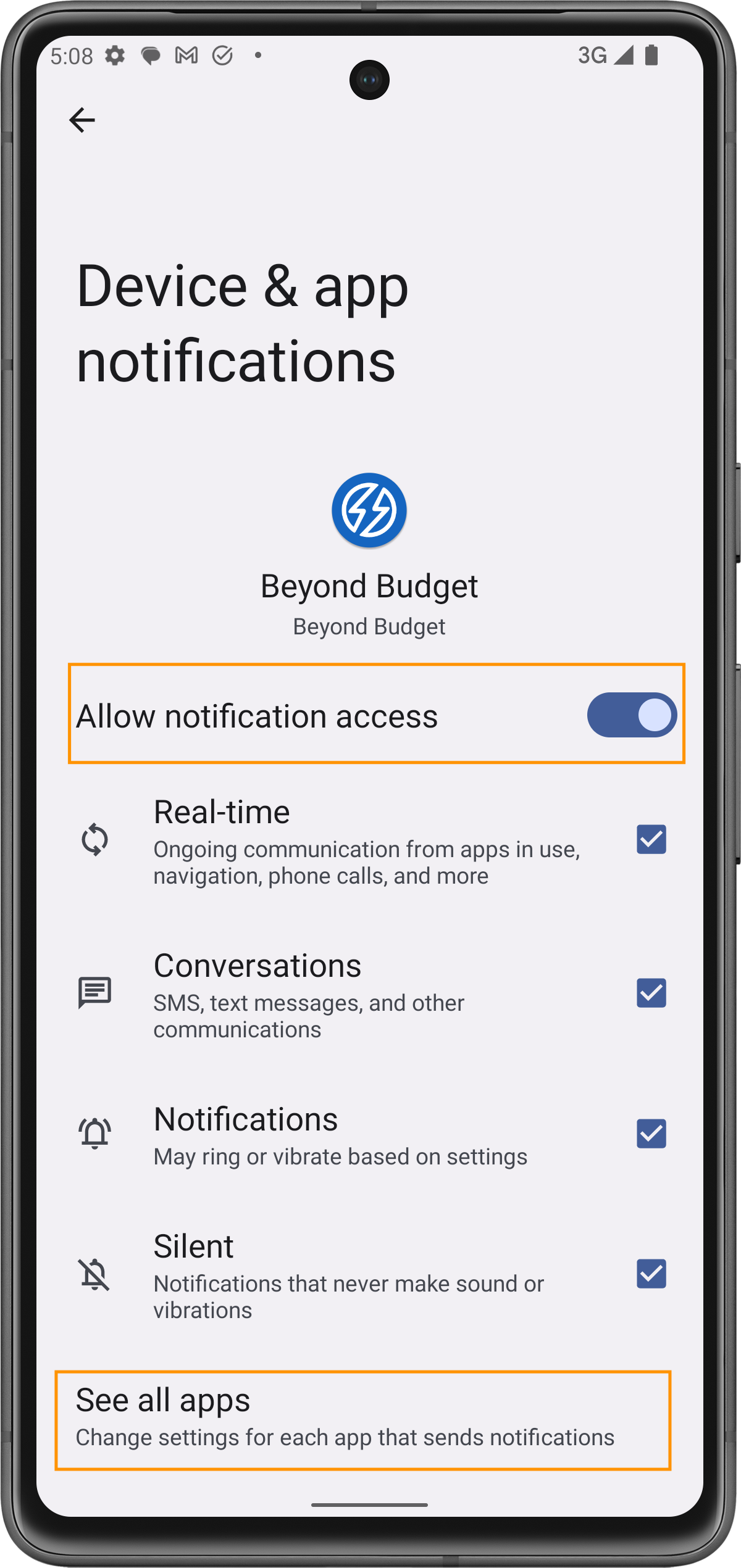 Sie werden dann zu den Android-Systemeinstellungen weitergeleitet, wo Sie der App die Berechtigung erteilen können, auf Ihre Benachrichtigungen zuzugreifen. Nach der Aktivierung kann die App beginnen, Ihre Finanztransaktionsbenachrichtigungen zu überwachen, um diese automatisch zu protokollieren.