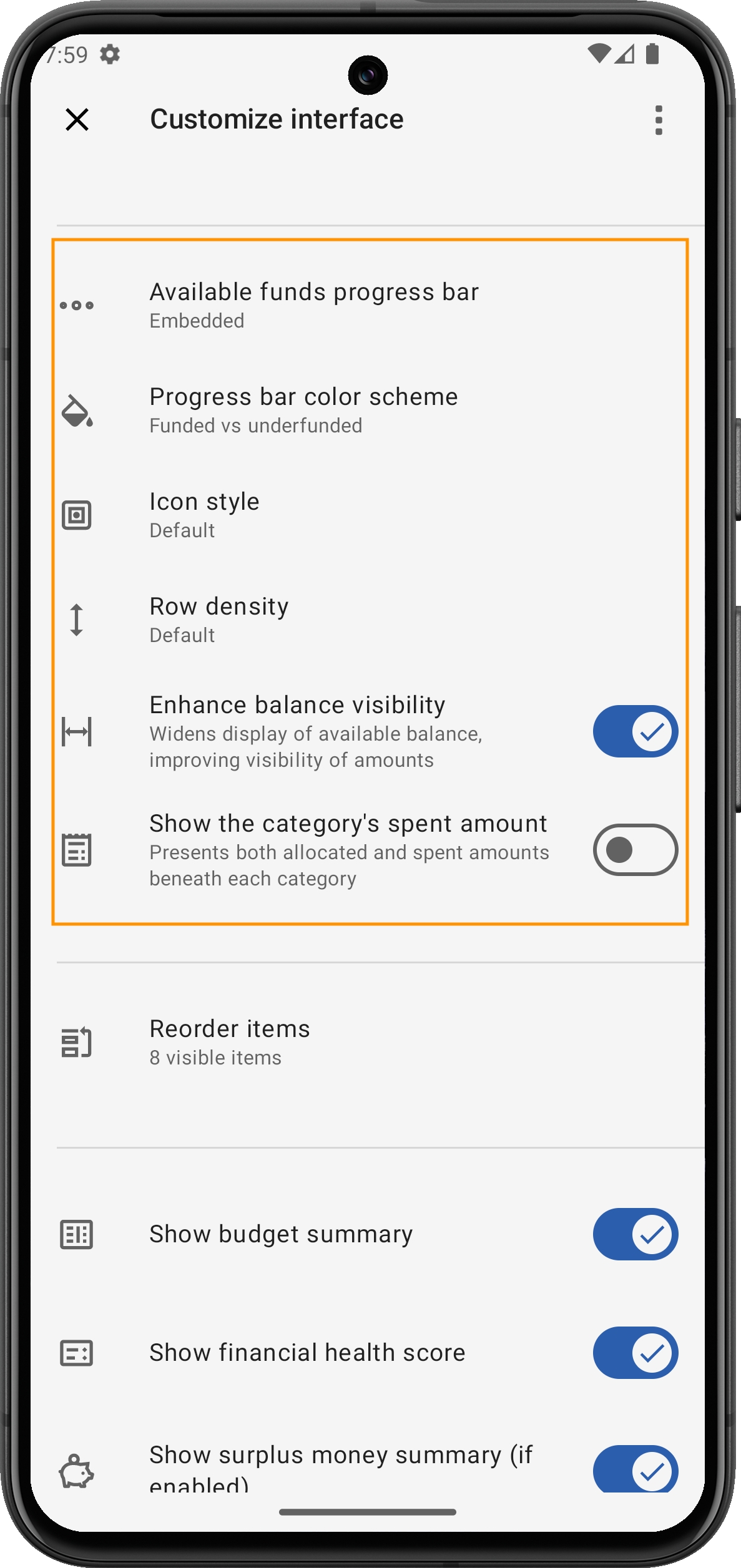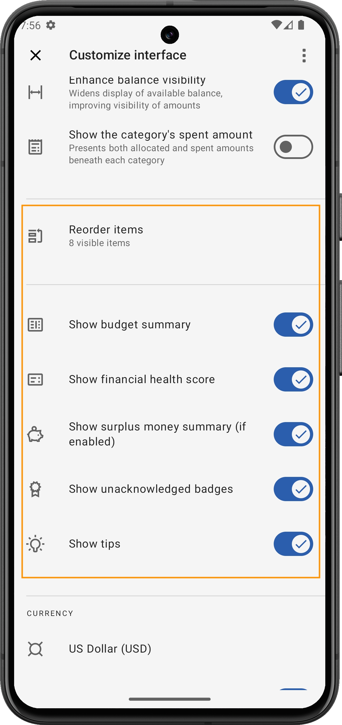 Neben der Möglichkeit, Elemente neu zu ordnen und umzuschalten, bietet die App weitere Anpassungsoptionen, wie zum Beispiel: