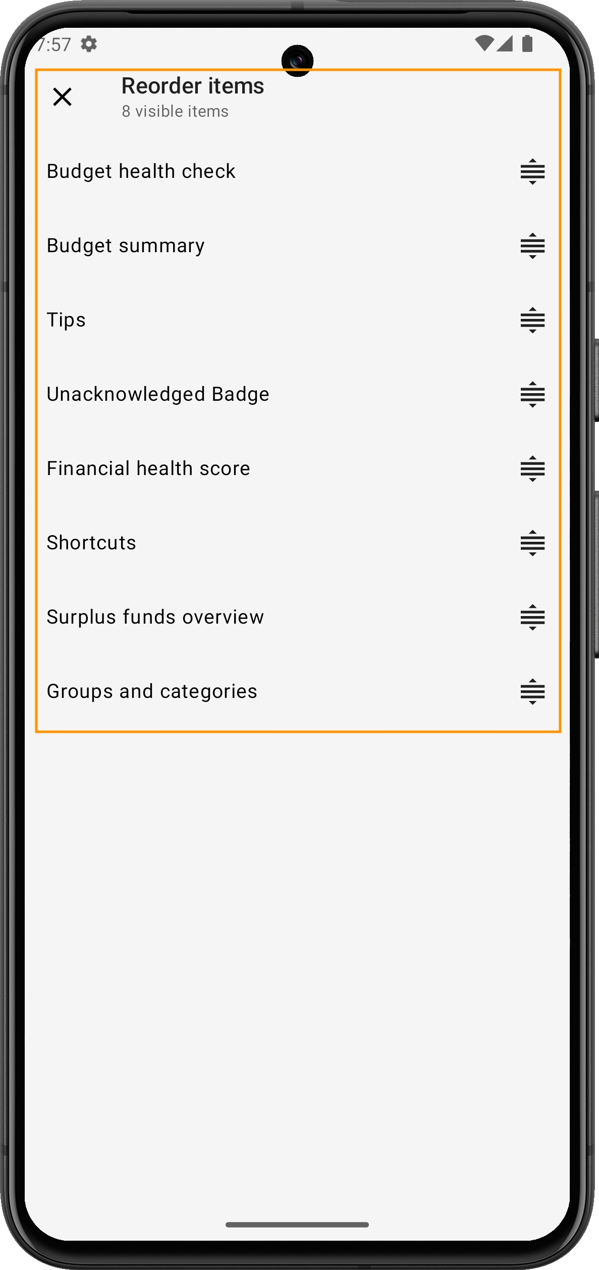 Tippen und halten Sie das Symbol neben dem Element, das Sie verschieben möchten (drei horizontale Linien).