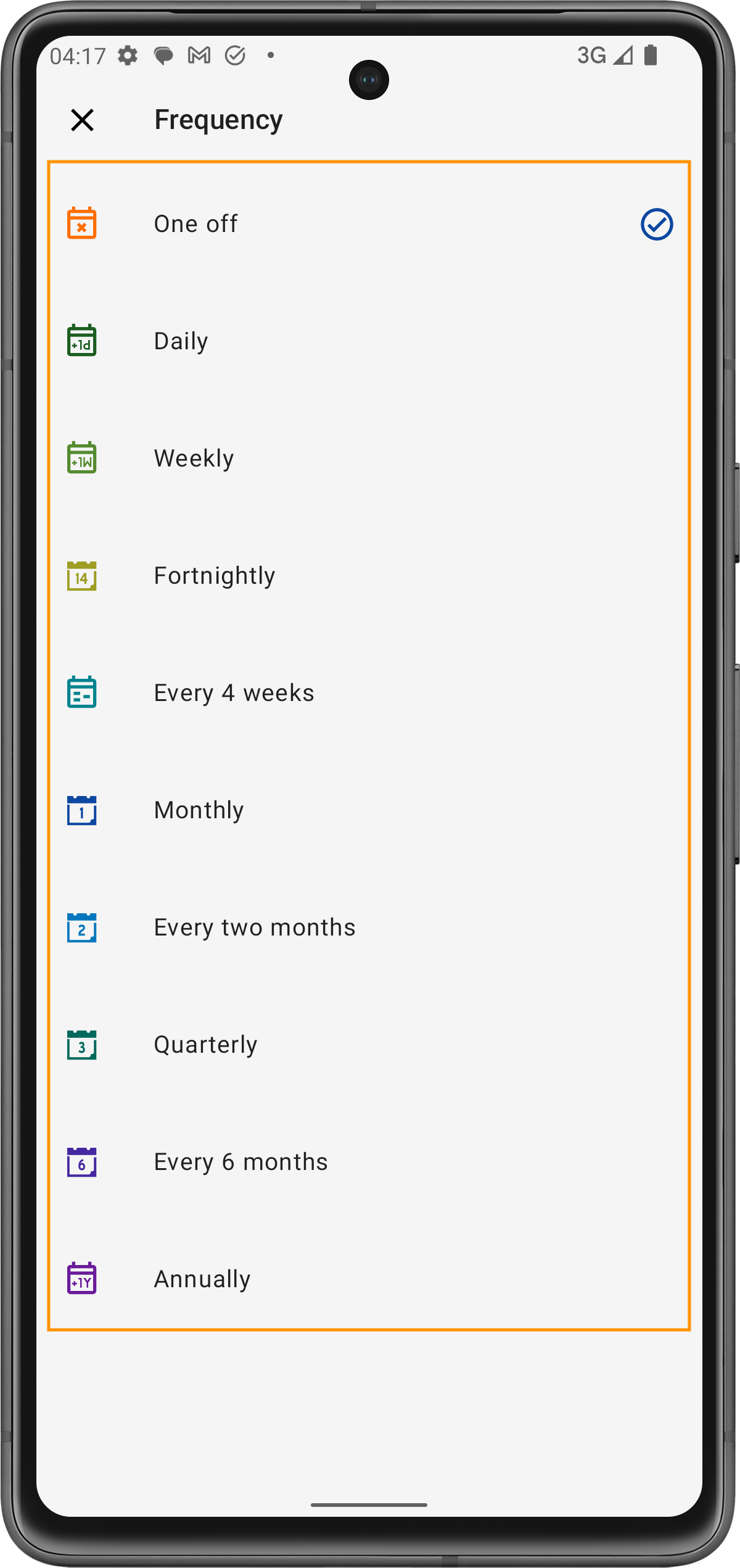 Wählen Sie, wie oft diese Transaktion wiederholt werden soll: täglich, wöchentlich, monatlich usw.