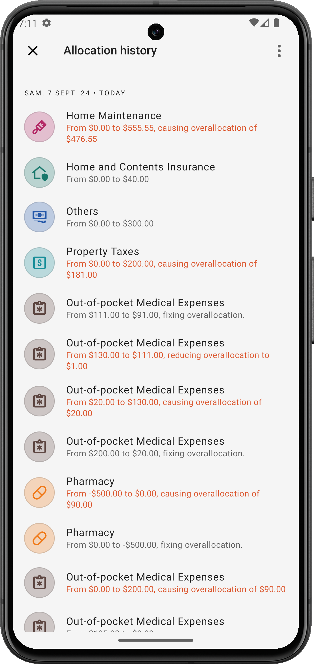 La app te mantiene informado cuando tus asignaciones superan tu ingreso disponible. Si has sobreasignado, aparecerá una advertencia clara en tu página de inicio, mostrando la cantidad exacta por la que tu presupuesto está sobreasignado. Esto te ayuda a identificar rápidamente el problema y tomar medidas para ajustar tu presupuesto.