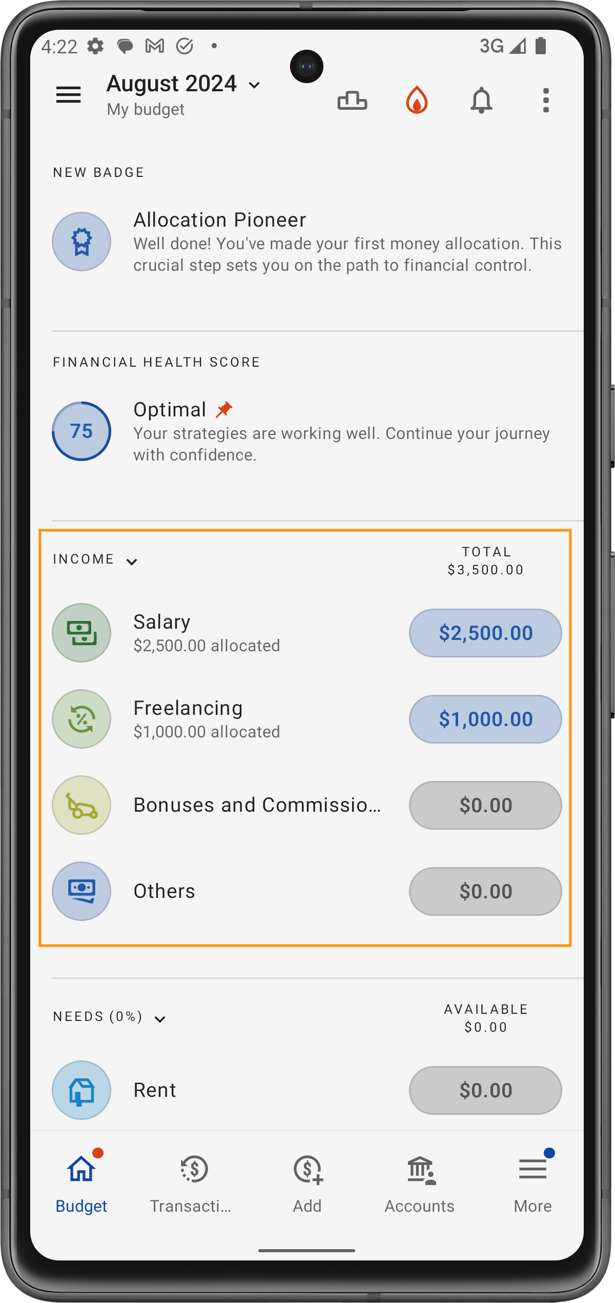 La app actualizará los montos a medida que los asignas, asegurando que tu ingreso total de $3,500 esté completamente asignado.