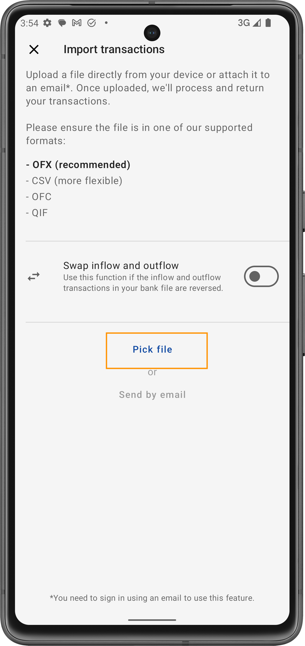 También puedes enviar el archivo de transacciones directamente desde tu computadora a [email protected], y la app procesará e importará automáticamente las transacciones por ti. Esta es una opción conveniente si tus archivos están almacenados en tu computadora.
