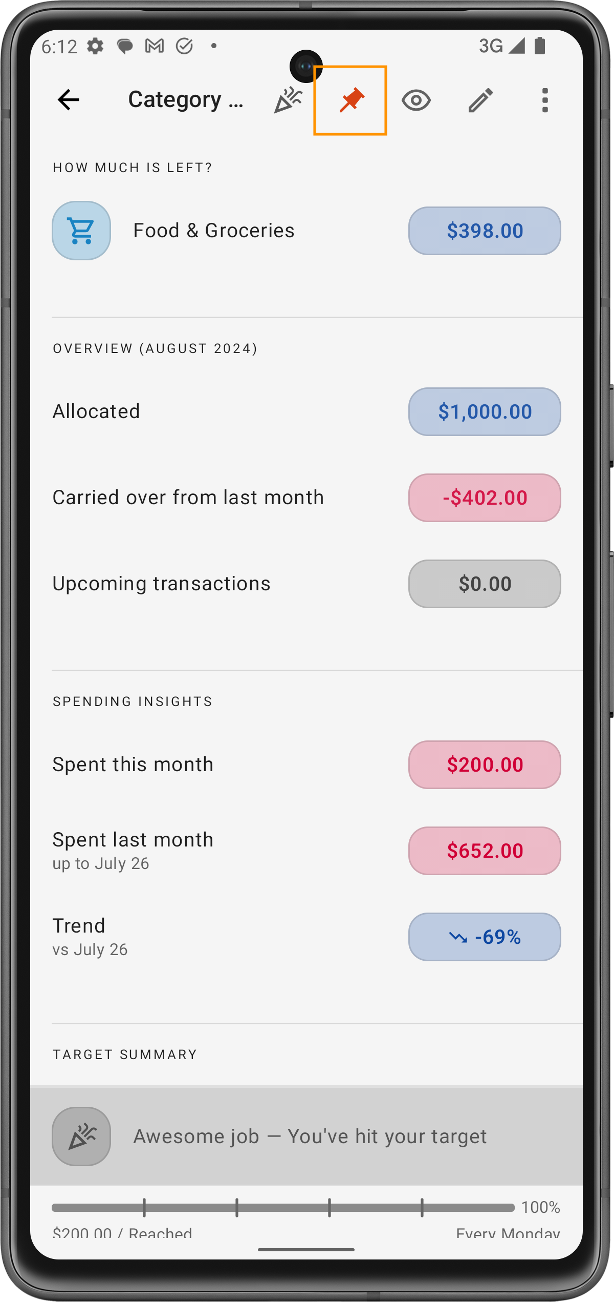 Fijar una Categoría: Para fijar una categoría, simplemente abre los detalles de la categoría y busca el icono de pin. Una vez fijada, esa categoría siempre aparecerá en la parte superior de tu lista de presupuesto, asegurando que esté visible cada vez que abras la aplicación.