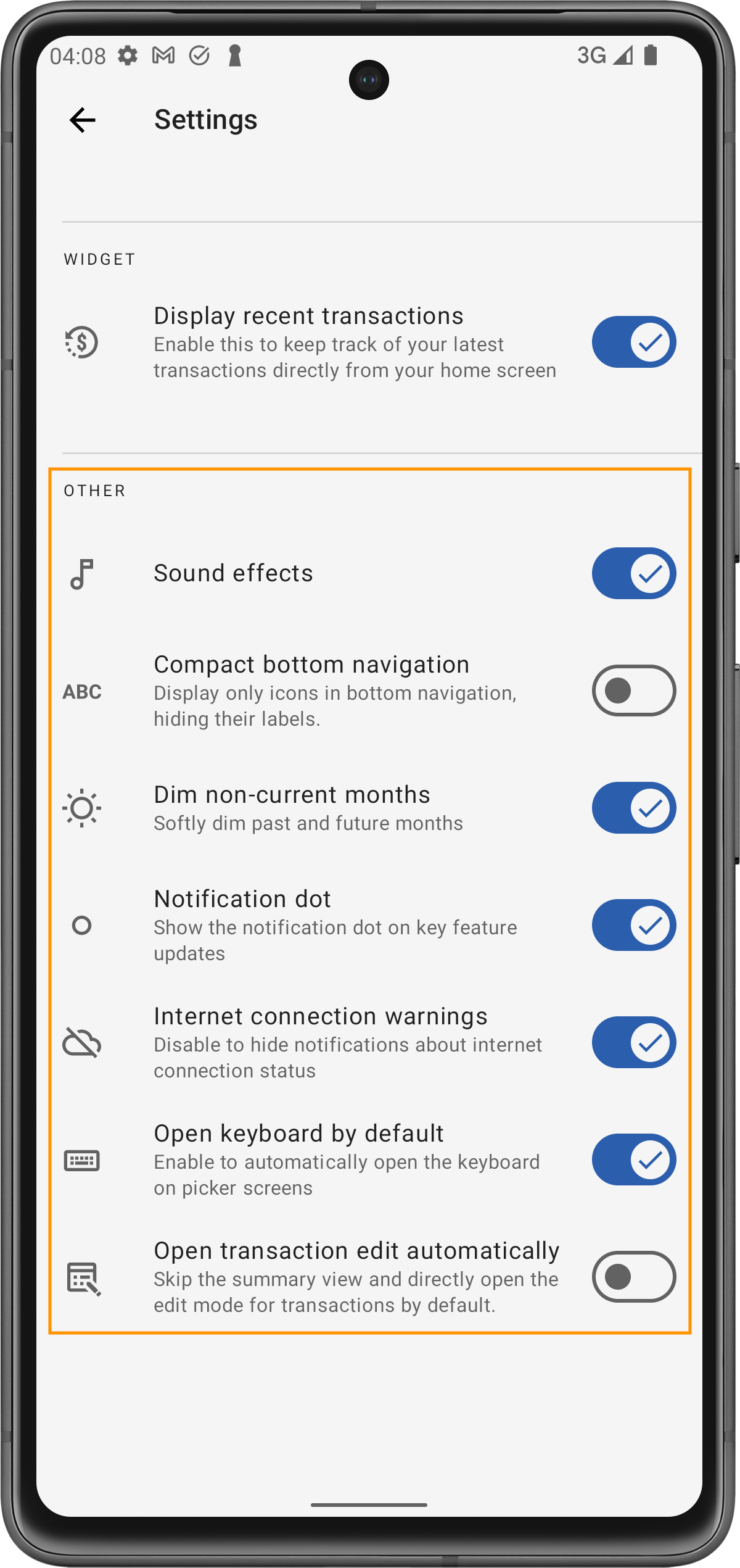 Cuando esta opción está activada, la app atenuará suavemente la apariencia de los meses pasados y futuros en las vistas de calendario. Esta pista visual te ayuda a centrarte en el mes actual, reduciendo distracciones y facilitando la gestión de tus finanzas en el presente.