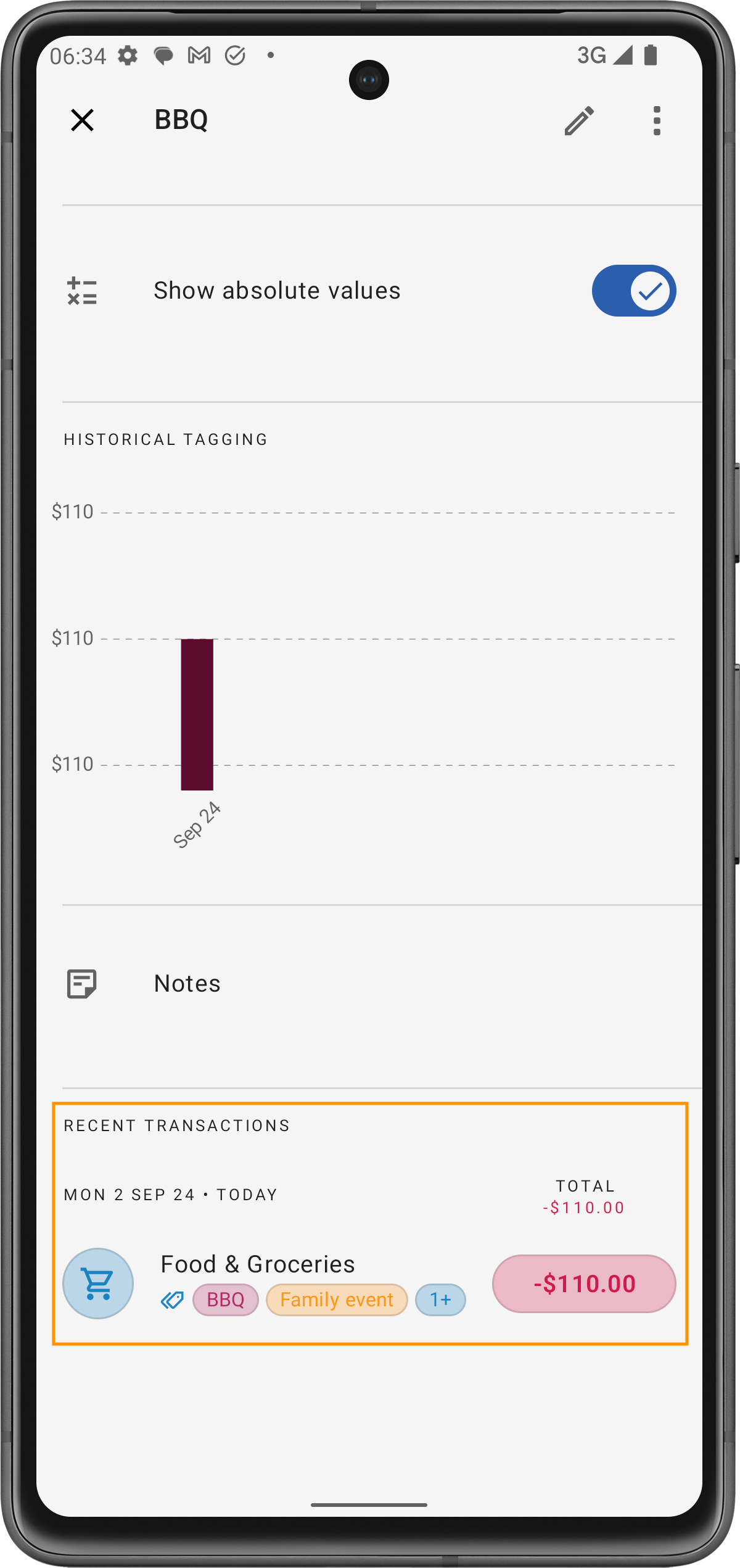 Caso de uso: Esto es útil para revisar rápidamente tus actividades más recientes. Por ejemplo, después de etiquetar una compra como Barbacoa, puedes verla de inmediato en la lista de transacciones recientes para asegurarte de que todo esté correctamente categorizado.