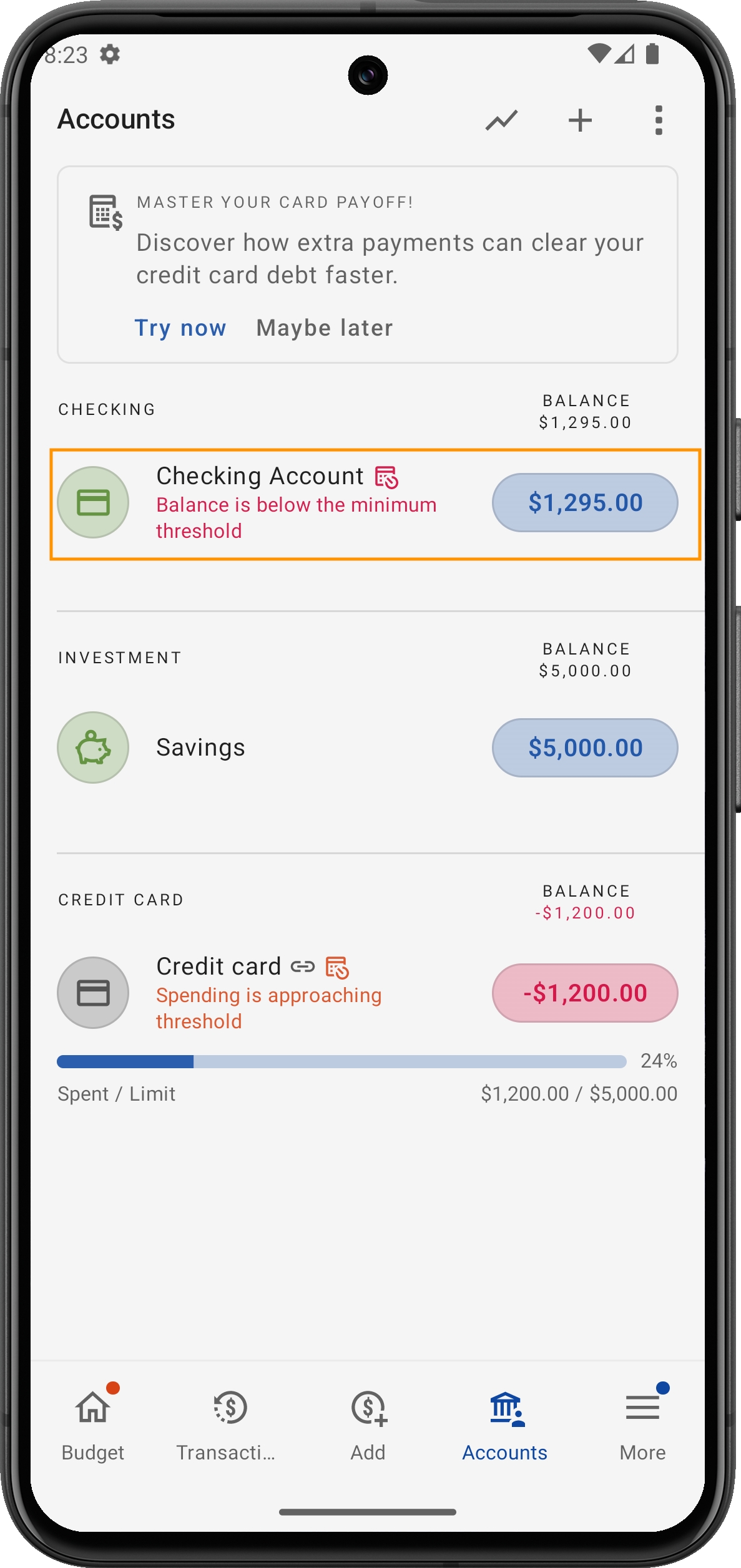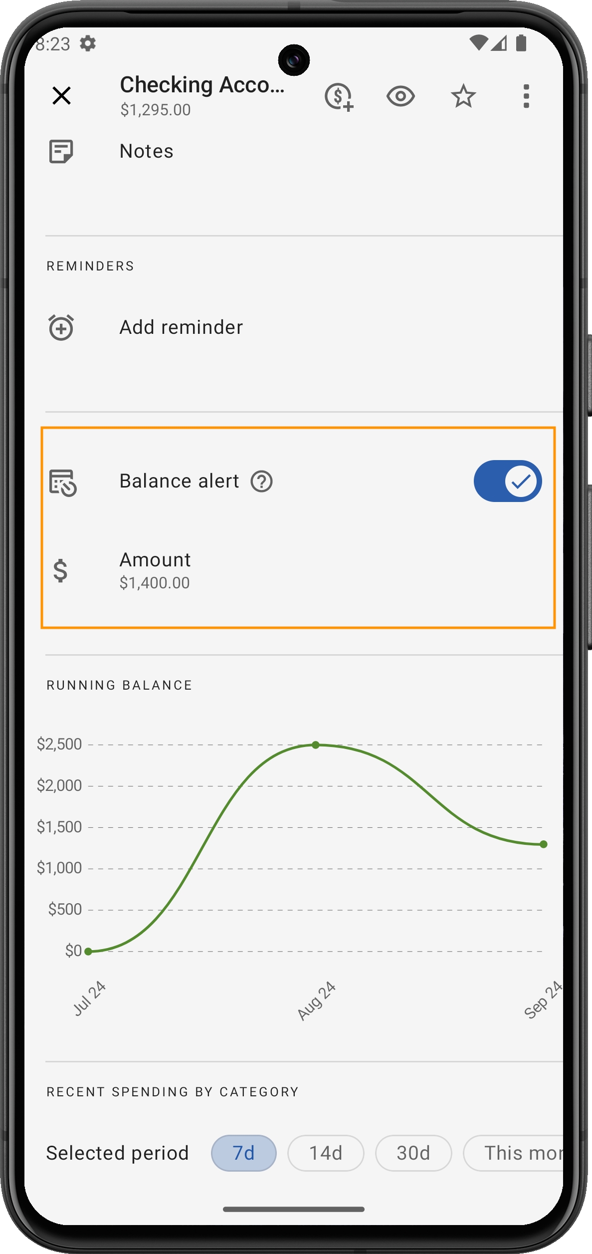 Comment ça marche : Définissez un montant de solde spécifique que vous ne souhaitez pas dépasser à la baisse. Lorsque votre solde s'approche ou passe en dessous de ce montant, l'application vous enverra une alerte, vous tenant informé de votre situation financière.