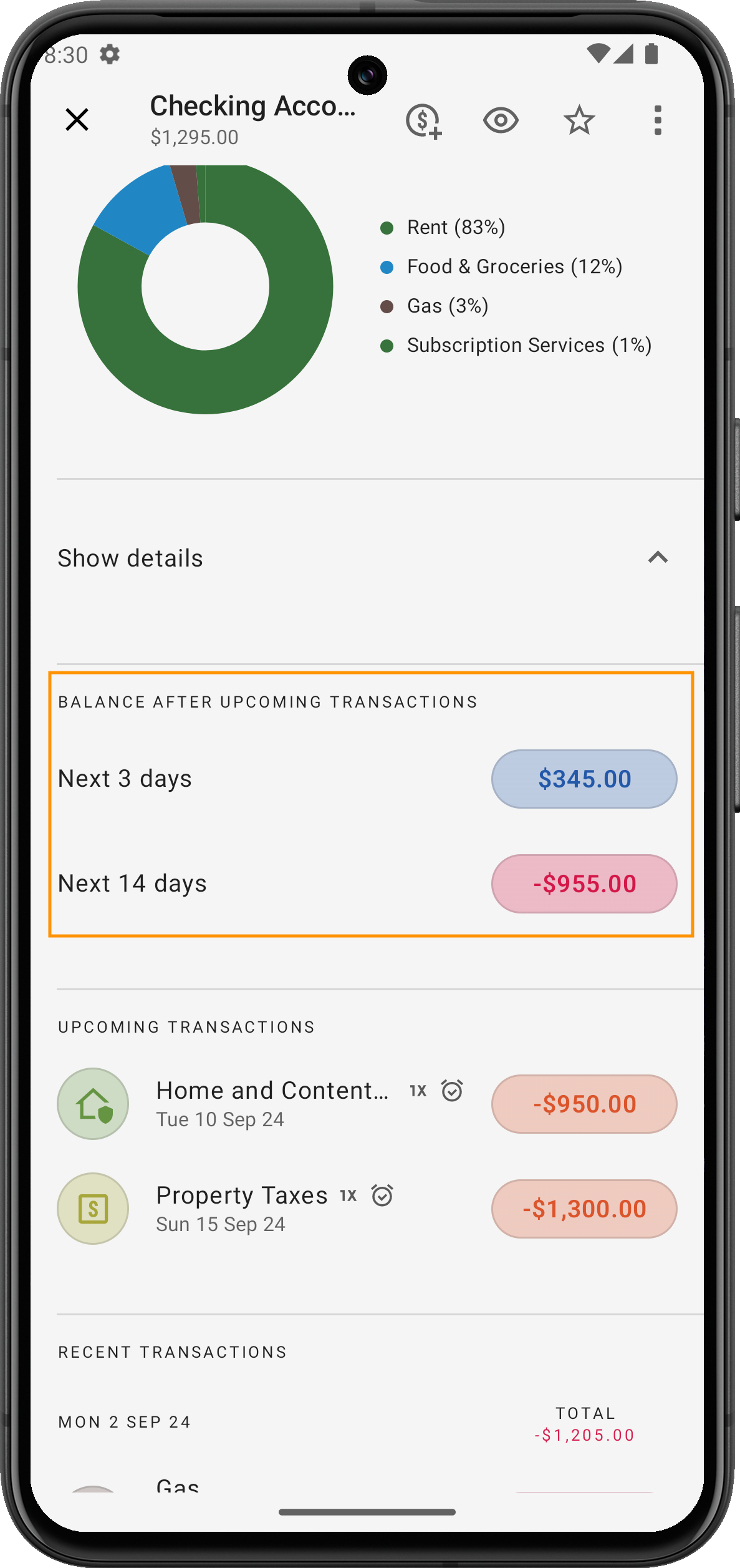 Transactions à venir : Affiche une liste des paiements à venir (par exemple, factures, abonnements) et leur impact sur le solde de votre compte.