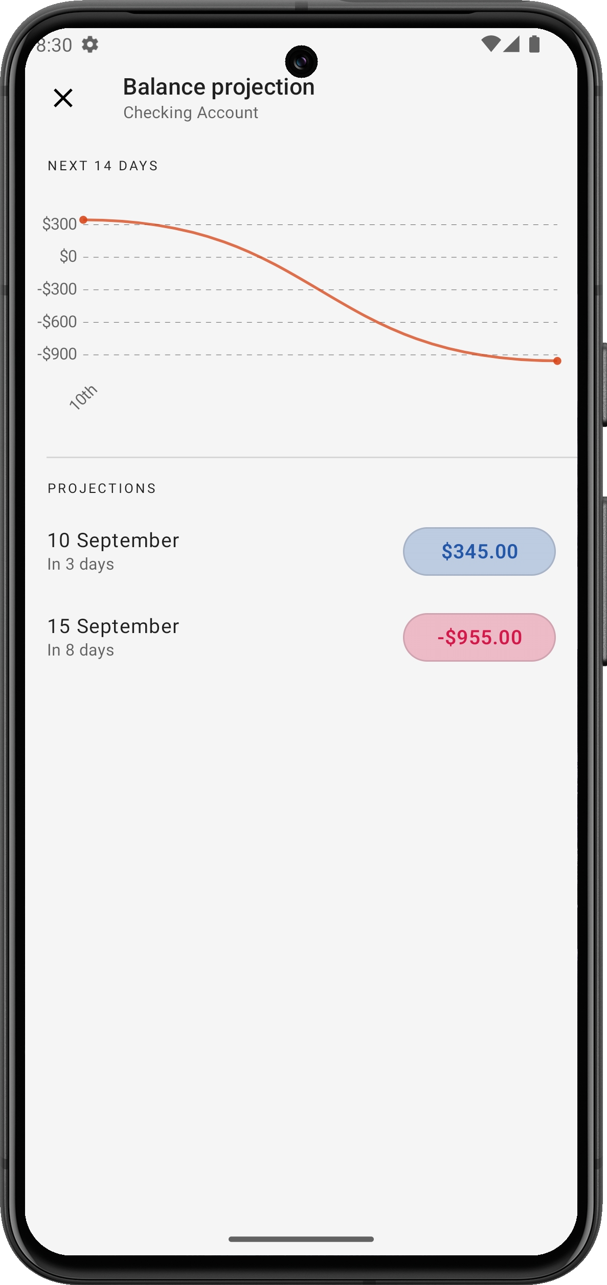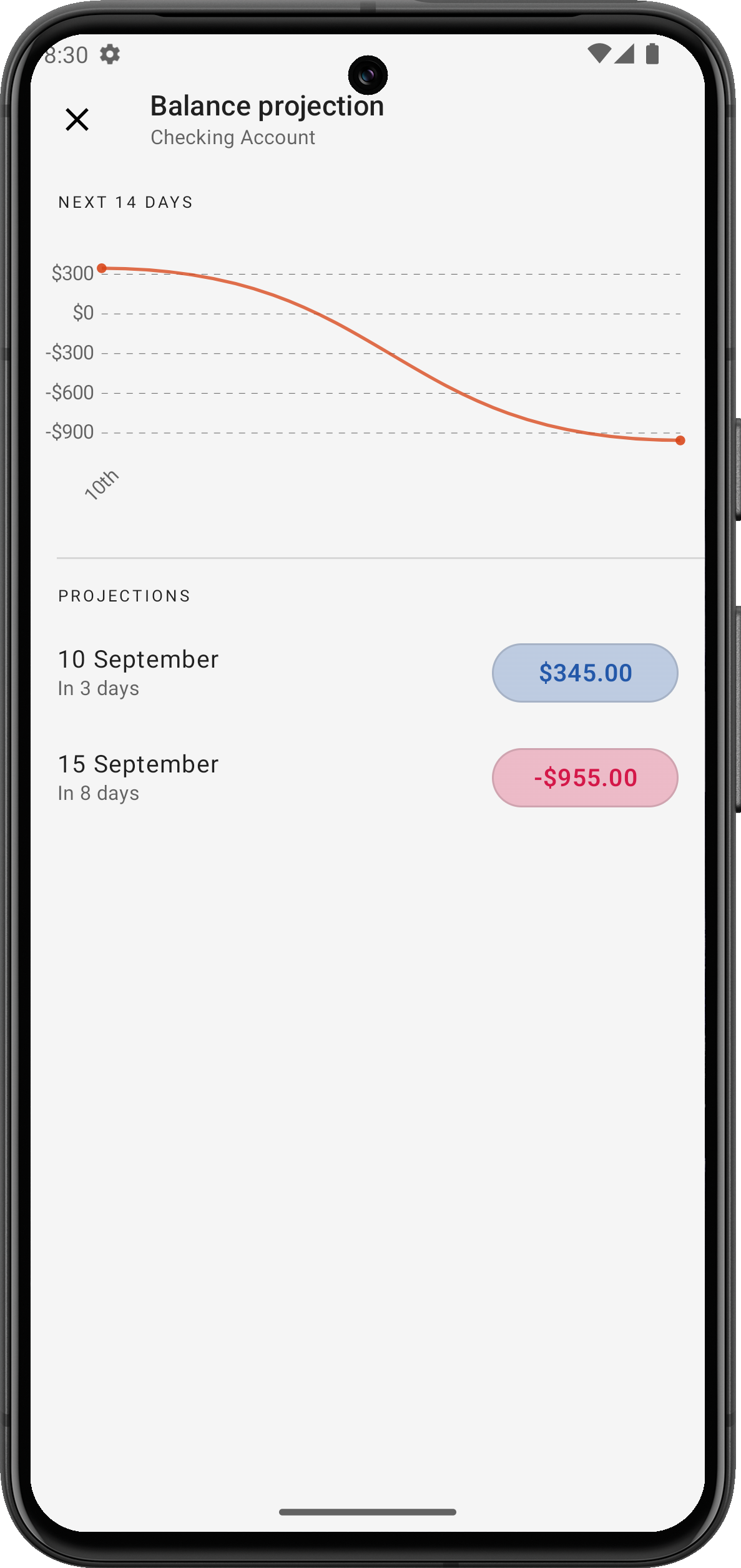 Projections pour plusieurs périodes : L'application décompose les prévisions de solde pour les 3 prochains jours, 7 prochains jours, 14 prochains jours, etc., jusqu'à 15 jours, vous offrant ainsi de la flexibilité dans la manière dont vous consultez votre situation financière.
