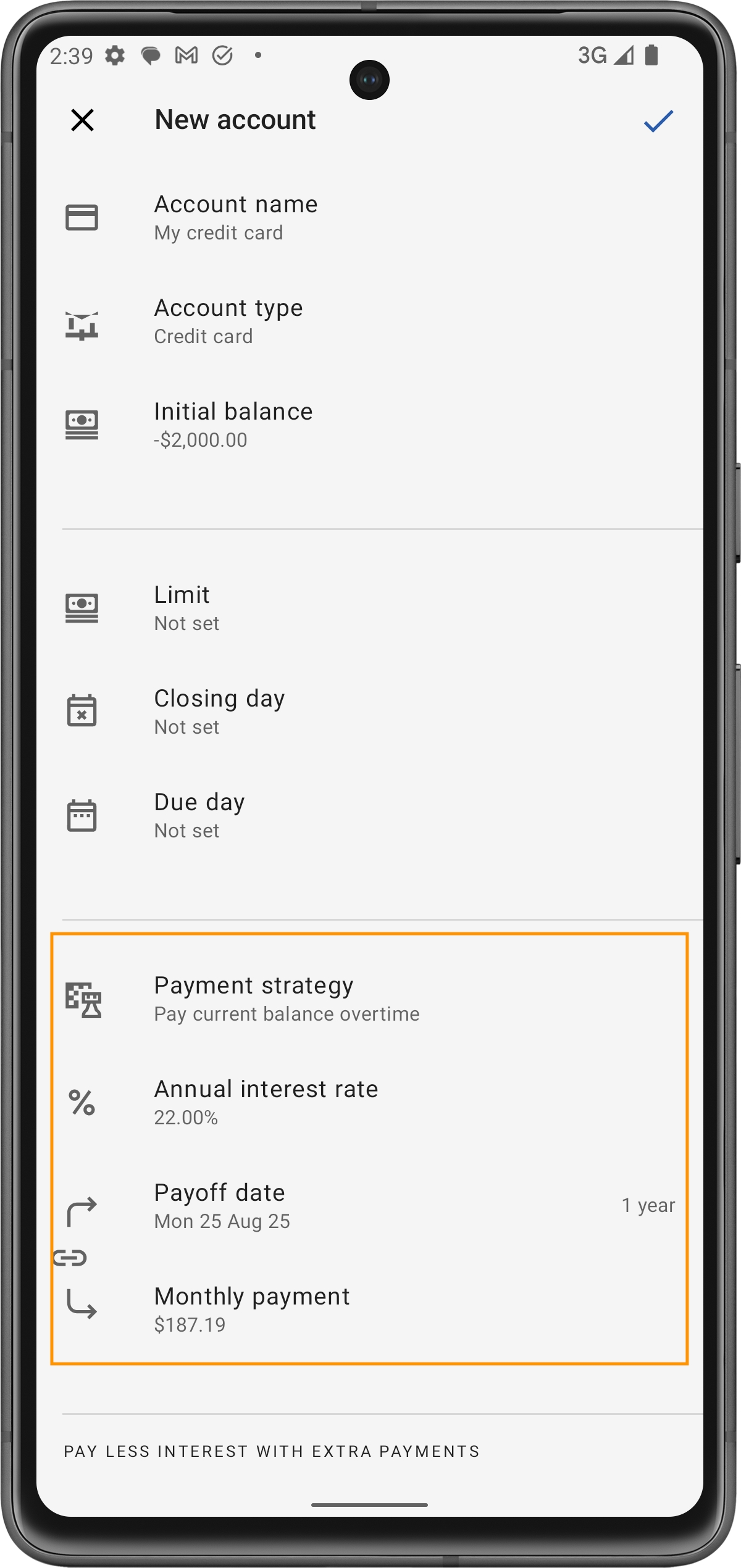Saisissez le solde et les détails : Entrez le solde actuel (généralement un chiffre négatif, représentant la dette due). Vous pouvez également définir des champs optionnels tels que la limite de crédit, la date d'échéance et le jour de clôture, qui aideront l'application à gérer vos remboursements.