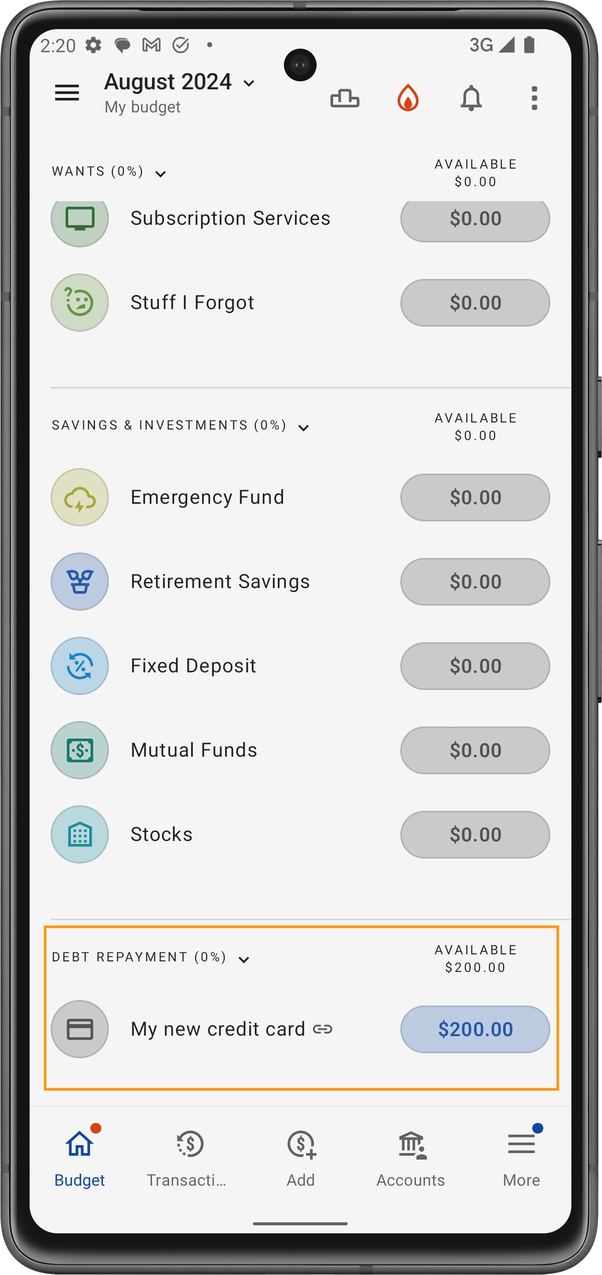 Après avoir configuré votre compte de carte de crédit, l'application crée une catégorie spéciale spécifiquement pour les paiements de carte de crédit. Toutes les dépenses effectuées avec la carte seront déplacées de leurs catégories respectives vers cette catégorie carte de crédit jusqu'à ce que la carte soit remboursée.