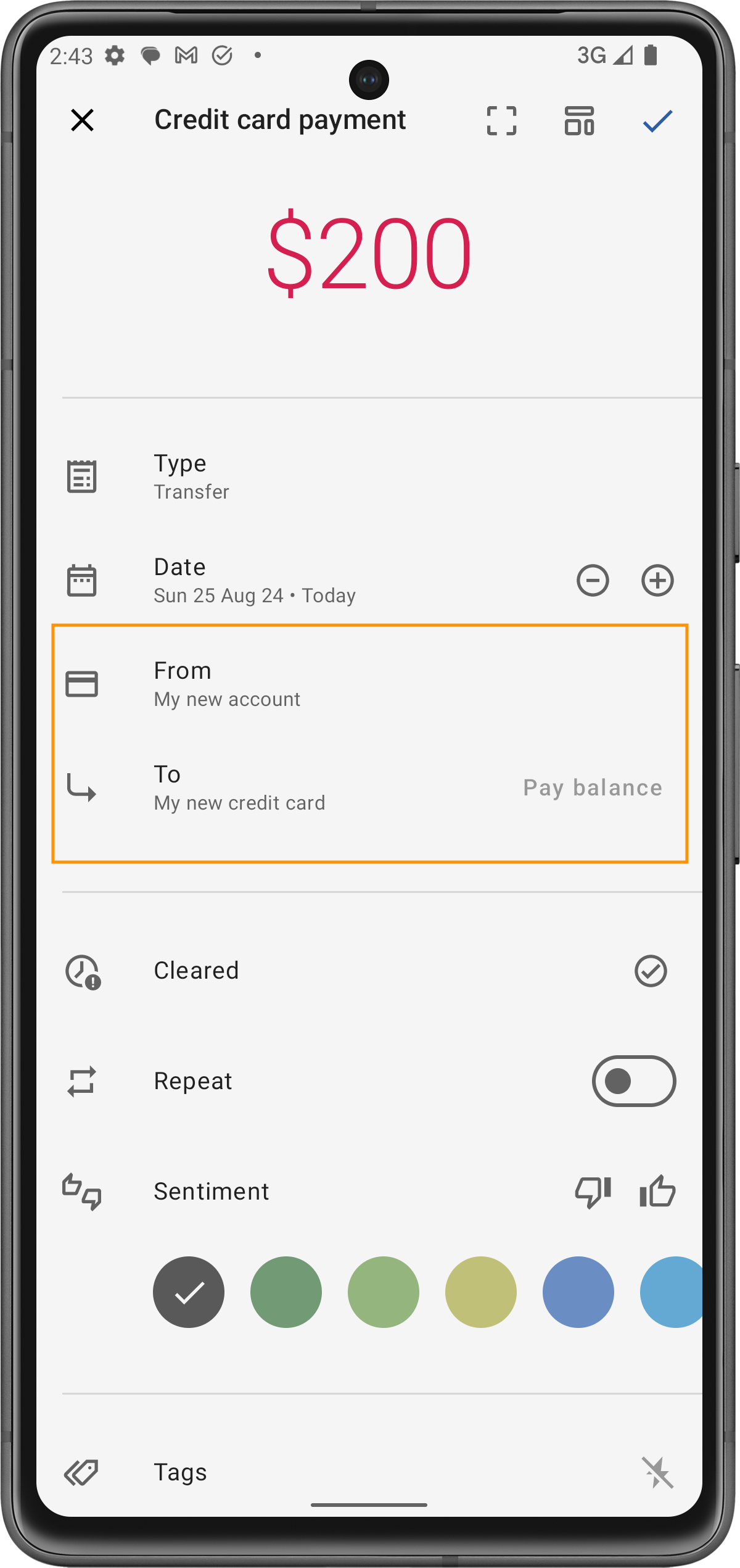 Appuyez sur Transférer et choisissez le compte de carte de crédit comme destination.