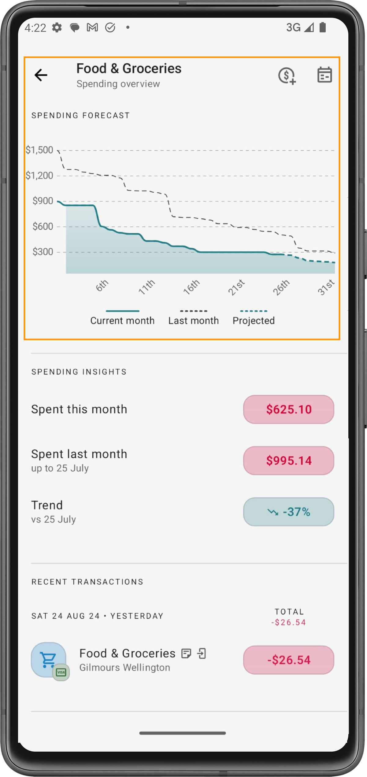 Chaque prévision de catégorie est accompagnée d'une ligne de tendance des dépenses, qui vous montre combien vous avez dépensé ce mois-ci par rapport aux mois précédents et où vous êtes susceptible de finir si vos dépenses continuent au même rythme. Les projections sont mises à jour en temps réel, s'ajustant ainsi à l'évolution de vos habitudes de dépenses au cours du mois.