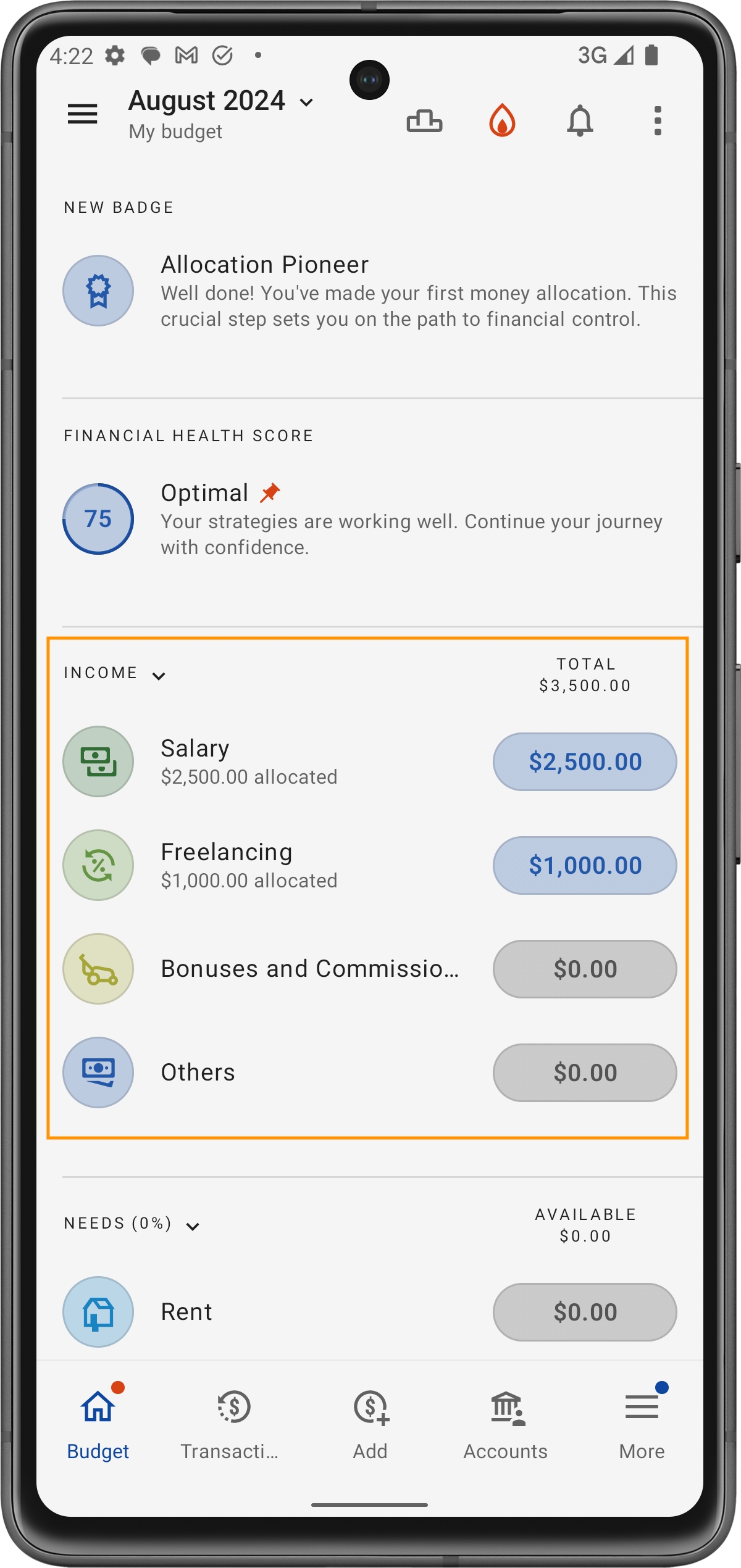 L'application mettra à jour les montants au fur et à mesure que vous les allouerez, s'assurant que votre revenu total de 3 500 $ est entièrement attribué.