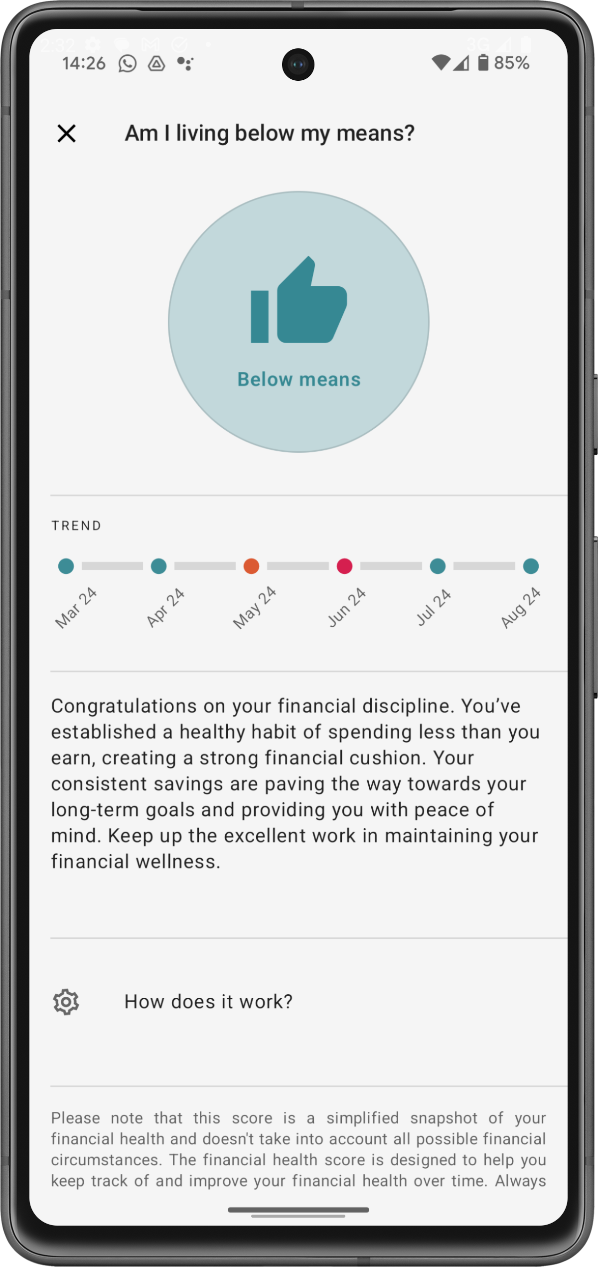Grâce à cet aperçu exclusif, l'application vous permet de prendre des décisions financières plus intelligentes basées sur des données en temps réel et des tendances. Que vous ayez besoin d'ajuster votre budget, de réduire certaines dépenses ou de continuer à renforcer vos habitudes de dépenses positives, l'outil "Est-ce que je vis en dessous de mes moyens ?" vous garantit d'avoir les connaissances nécessaires pour garder vos finances saines et durables.