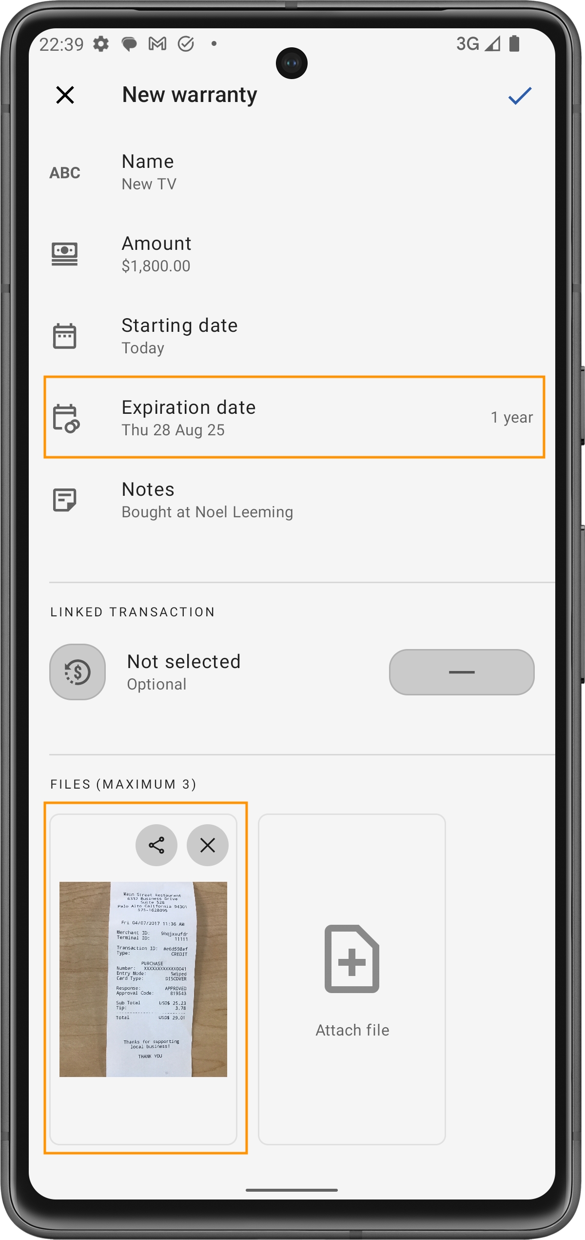 Vous pouvez, si vous le souhaitez, lier une transaction et télécharger une image de votre reçu ou de votre carte de garantie. Cela est fortement recommandé pour avoir toute la documentation nécessaire en cas de réclamation.
