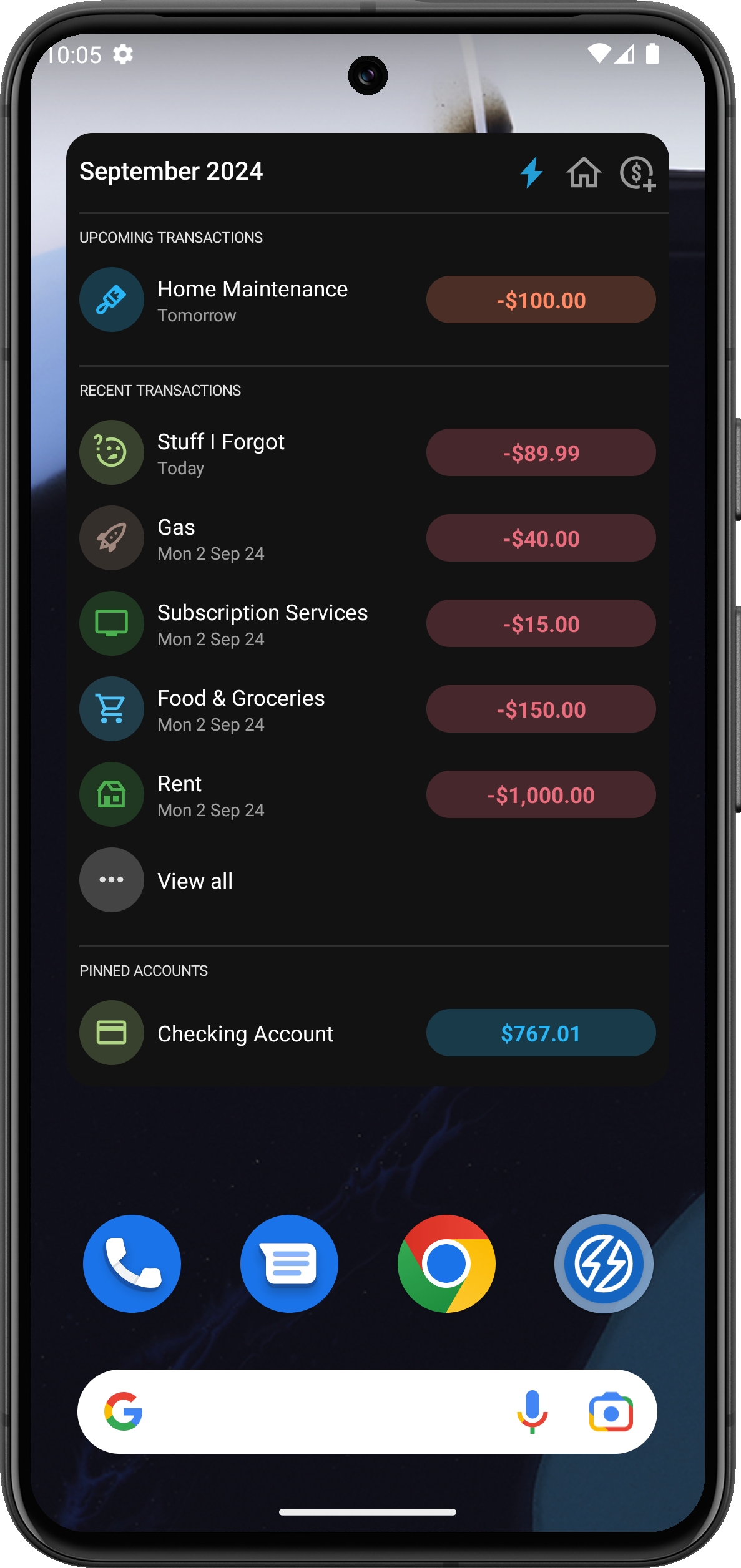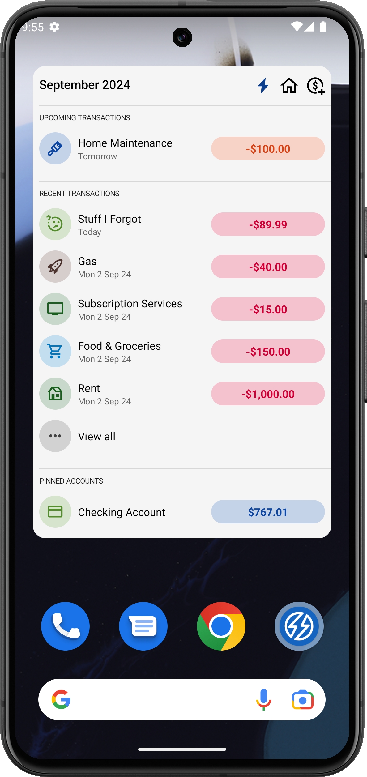 Ce widget vous fournit un aperçu de vos informations financières les plus importantes, comme les comptes ou catégories épinglés, les paiements à venir et les transactions récentes. Il permet une interaction instantanée — que ce soit pour ajouter une transaction rapide, consulter les détails d'une facture à venir ou simplement suivre vos dépenses sans ouvrir l'application. En cliquant sur un élément, vous pouvez l'ouvrir en détail pour une gestion plus approfondie.