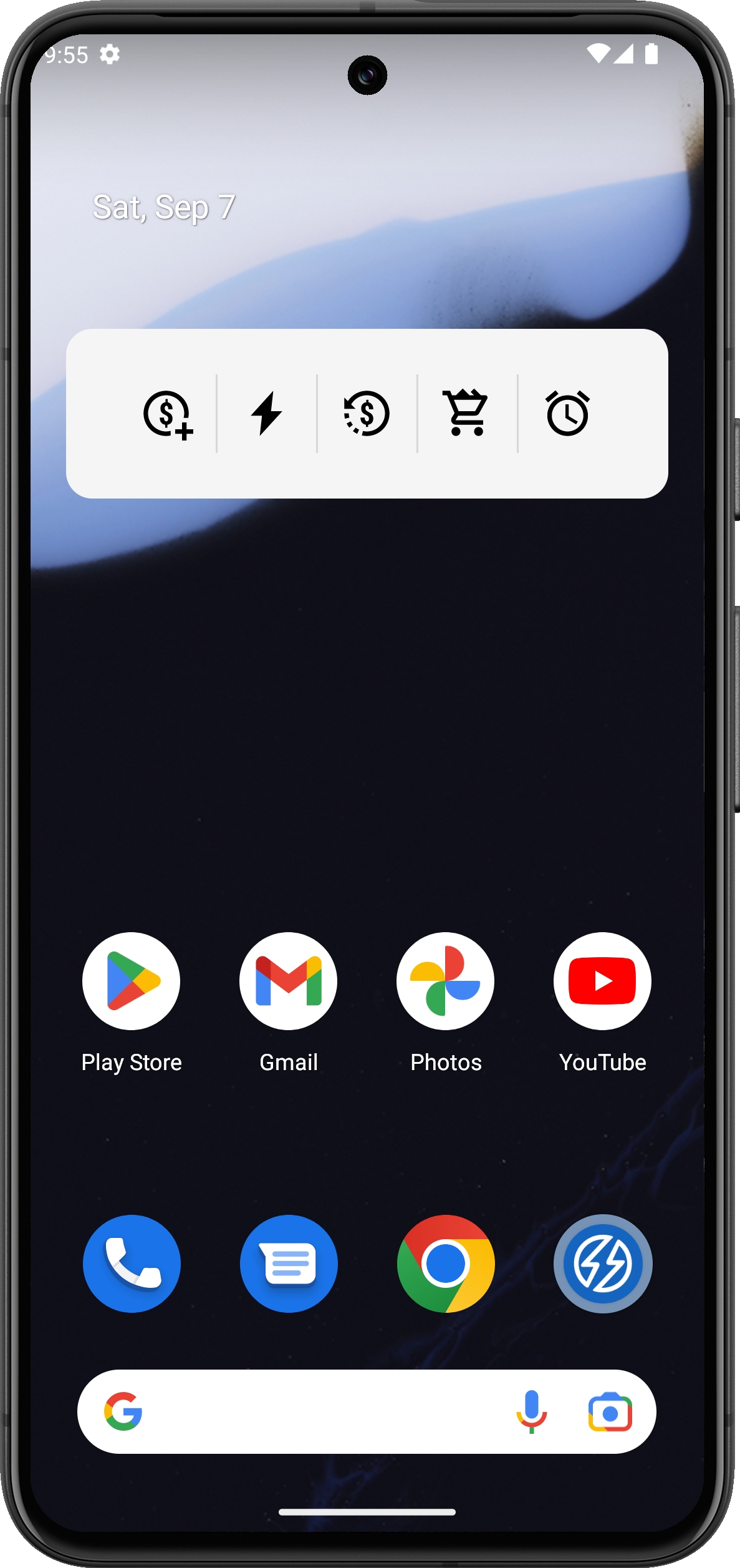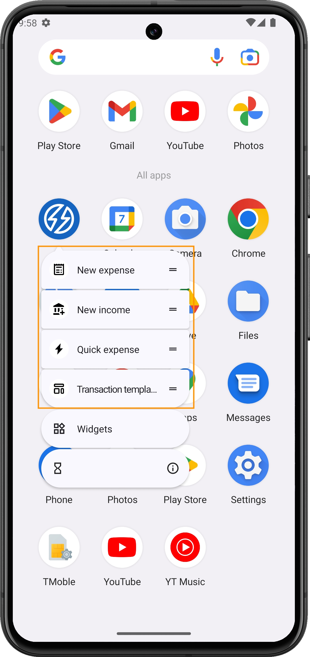 Conçu pour un accès rapide aux tâches essentielles, ce widget propose des raccourcis pour ajouter de nouvelles transactions, définir des rappels, gérer une liste de courses, et bien plus encore. C'est le widget de référence pour les utilisateurs souhaitant simplifier les actions fréquentes et gérer leurs finances quotidiennes avec un minimum d'effort.