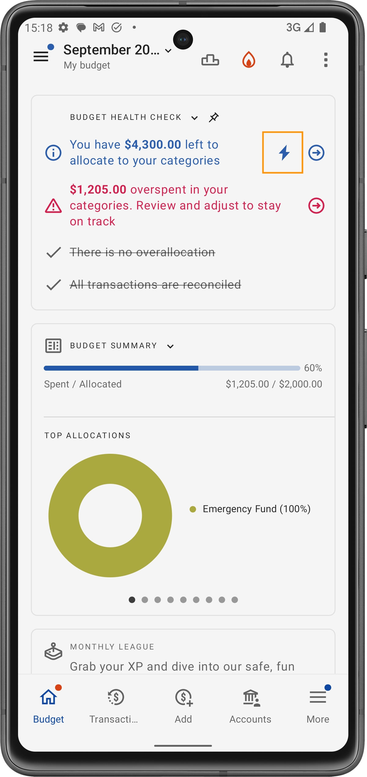 Sélectionner Auto Allocation : Dans la section Budget Health Check, recherchez l'icône éclair (⚡) à côté de votre résumé budgétaire.
