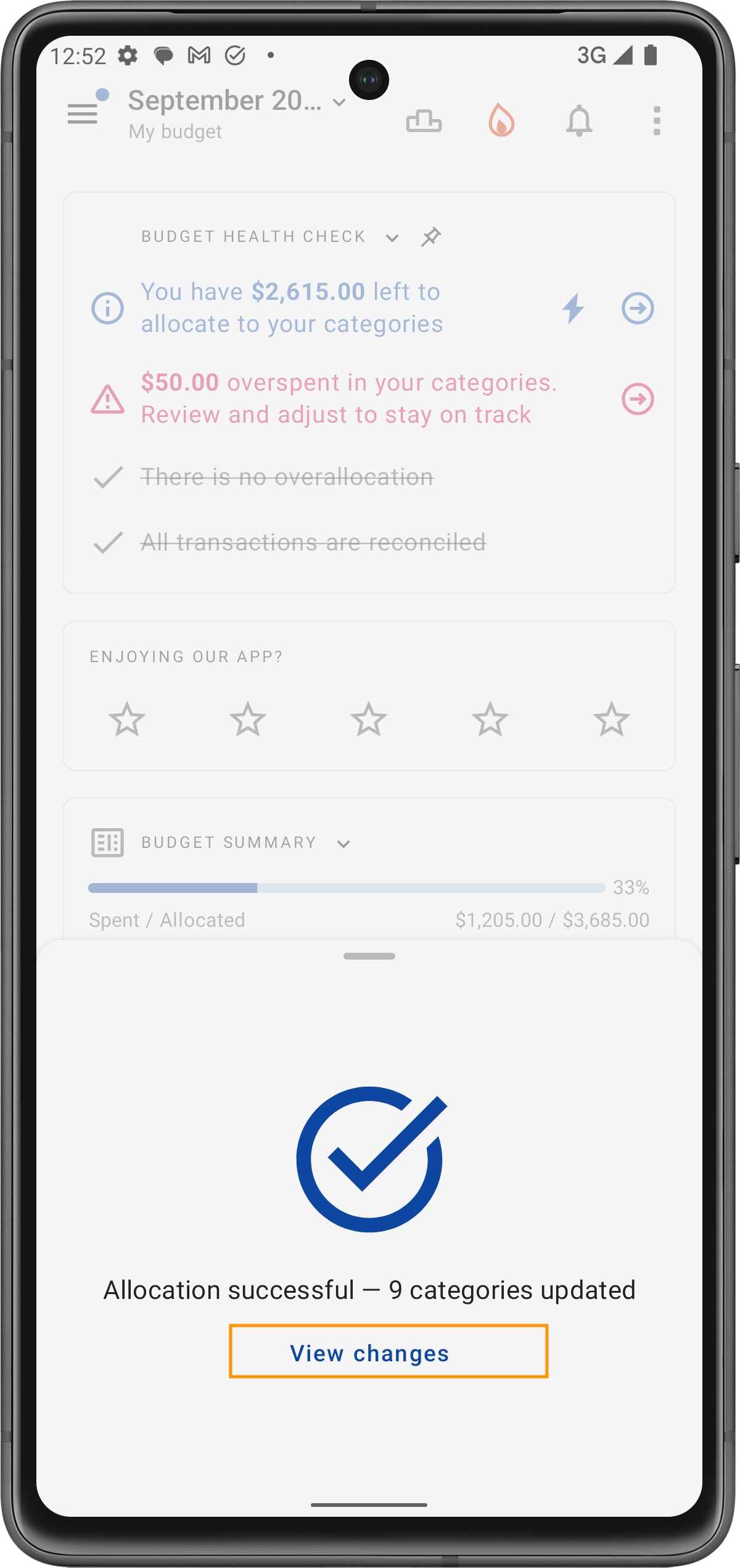 Voir les changements d'allocation : Après le processus d'allocation, un résumé montrera comment les fonds ont été répartis entre vos catégories.