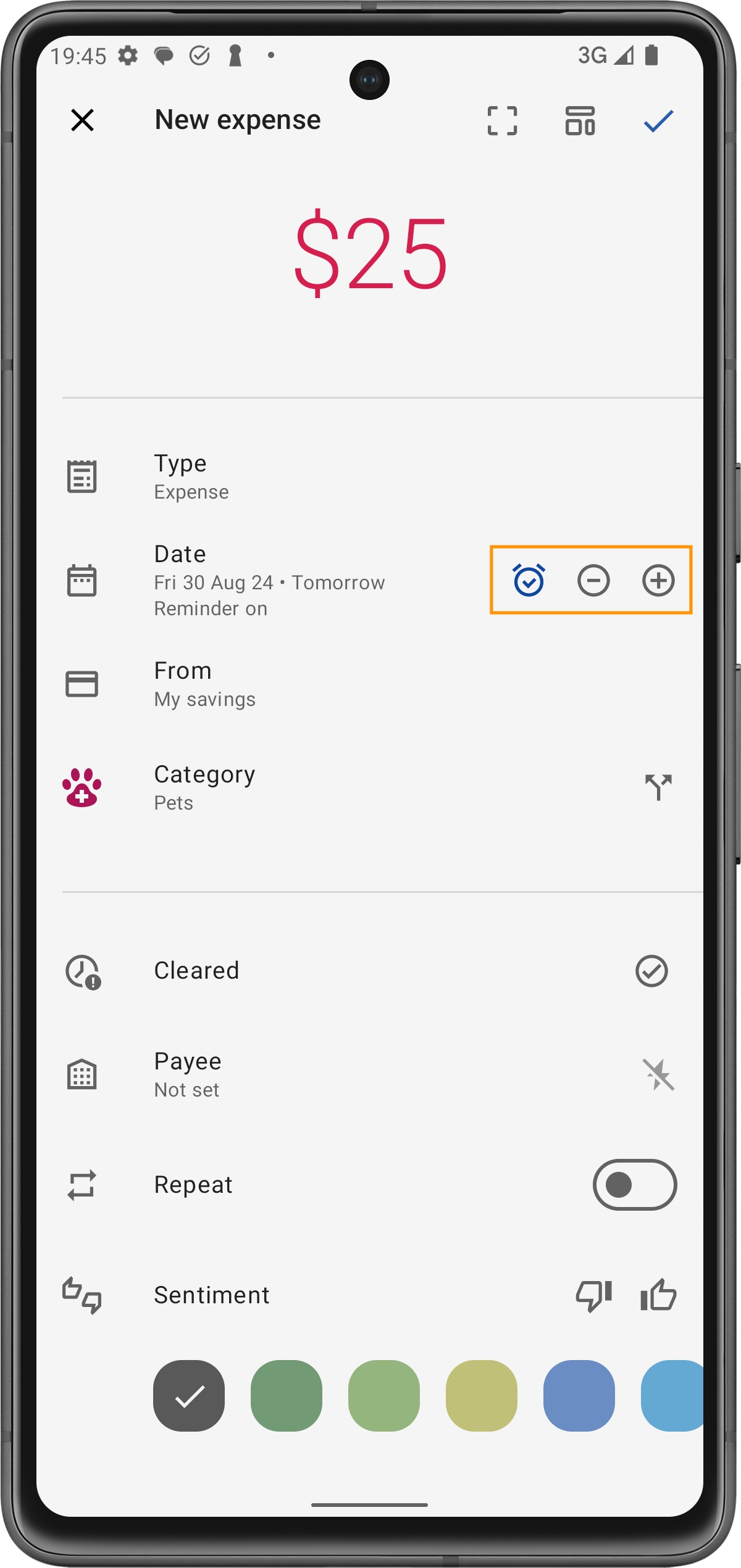 Une fois tous les détails saisis, appuyez sur l'icône Enregistrer (✓) dans le coin supérieur droit pour enregistrer cette dépense future.