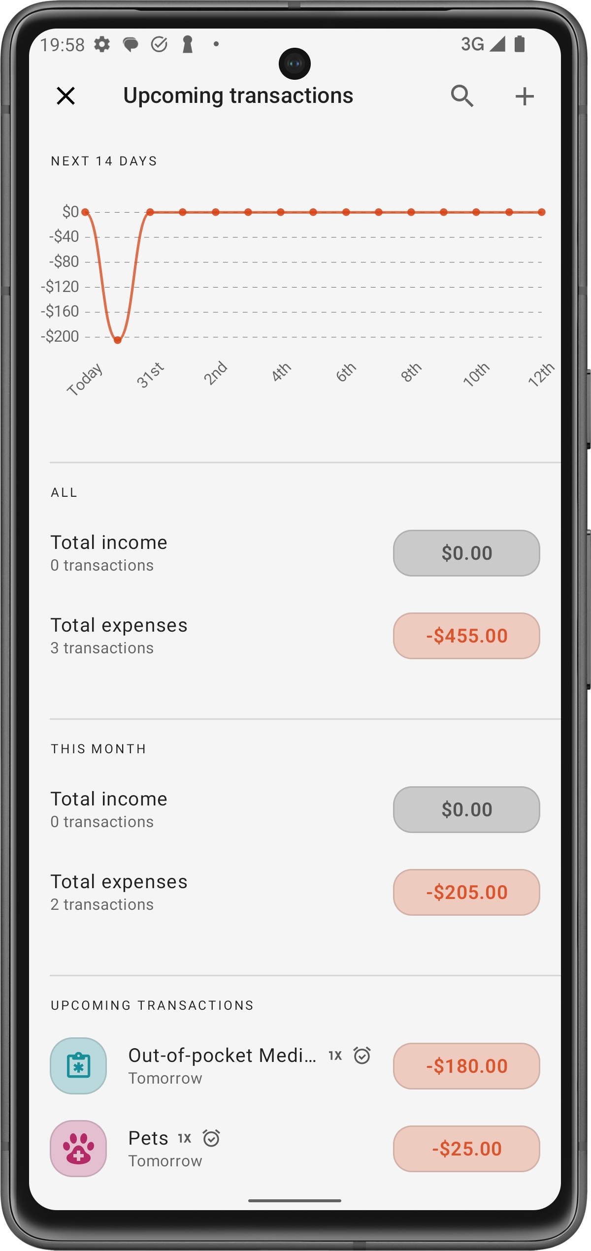 Chaque entrée affiche la date, la catégorie et le montant du paiement futur.