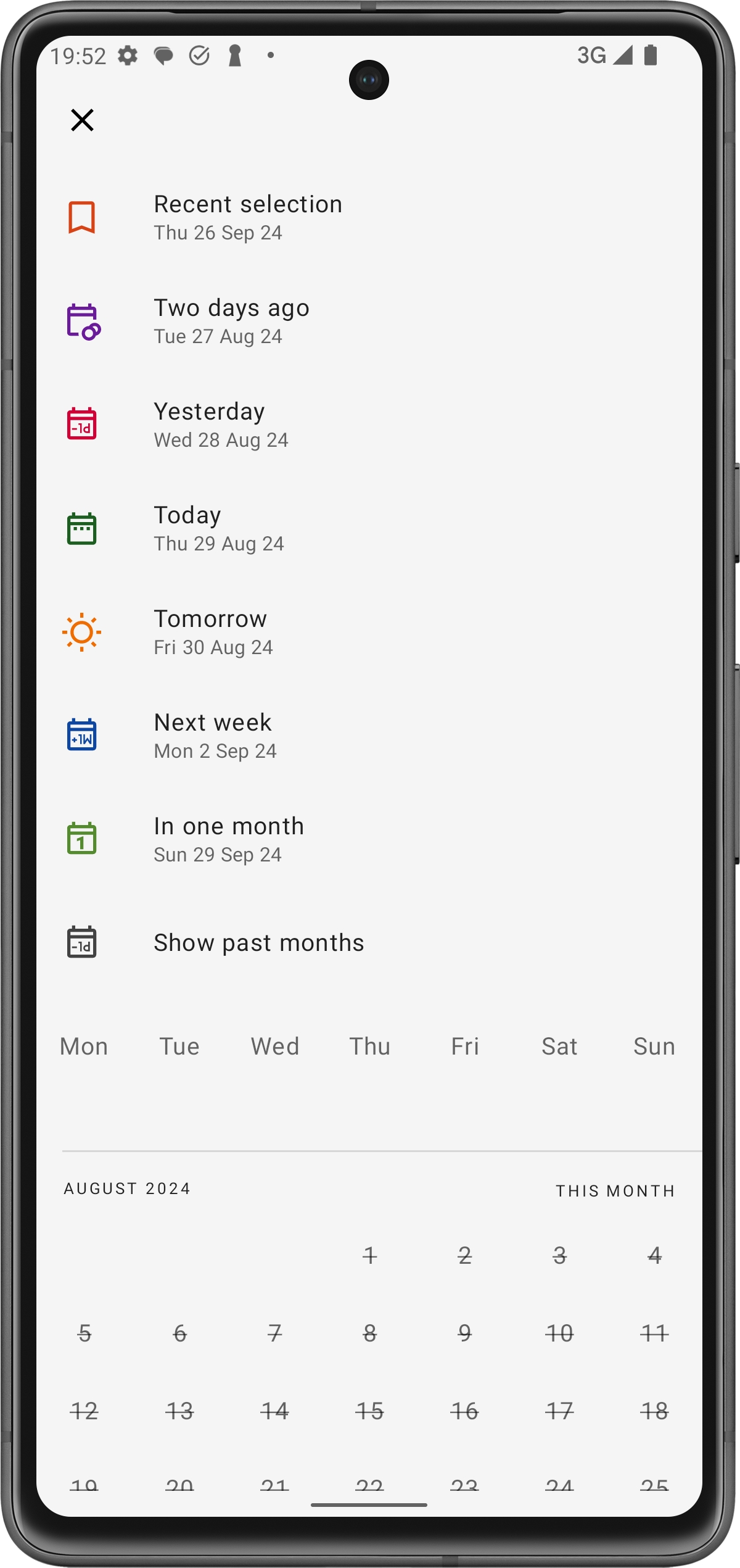 Vous pouvez sélectionner une date future en appuyant sur l'icône plus (+) jusqu'à atteindre la date souhaitée ou cliquer dans le champ pour ouvrir tout le calendrier.