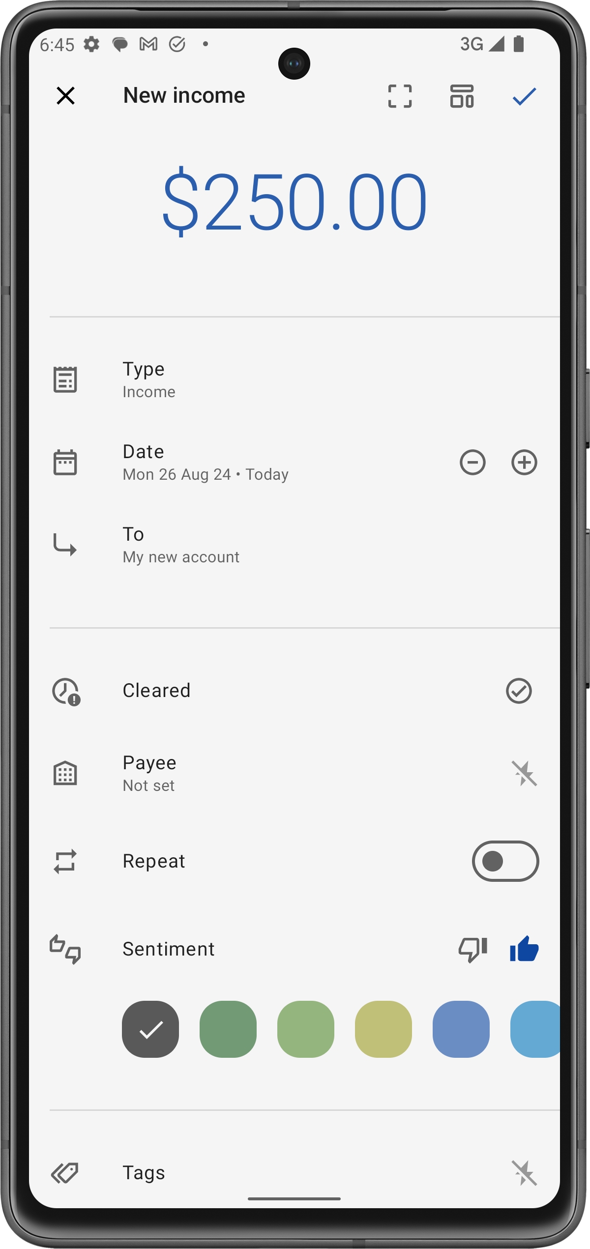 Il n'est pas nécessaire d'assigner une catégorie ou de spécifier un compte "De" pour les transactions de revenu. En enregistrant avec précision où votre revenu est déposé, vous vous assurez que votre budget reflète la croissance de vos fonds disponibles.