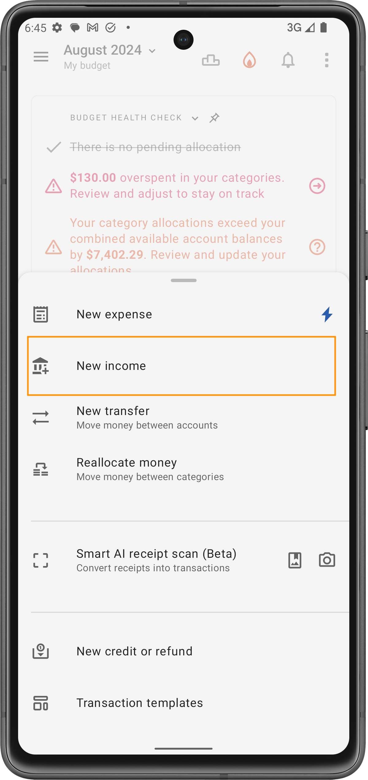 Lorsque vous utilisez un budget base zéro, les transactions de revenu déclencheront un avertissement dans le Contrôle de Santé du Budget si les fonds nouvellement reçus ne sont pas alloués. Ce rappel est utile pour s'assurer que chaque dollar est attribué à une catégorie, garantissant que tout l'argent entrant est affecté à vos catégories budgétaires. Ainsi, vous restez en phase avec vos objectifs financiers et maintenez un budget équilibré.