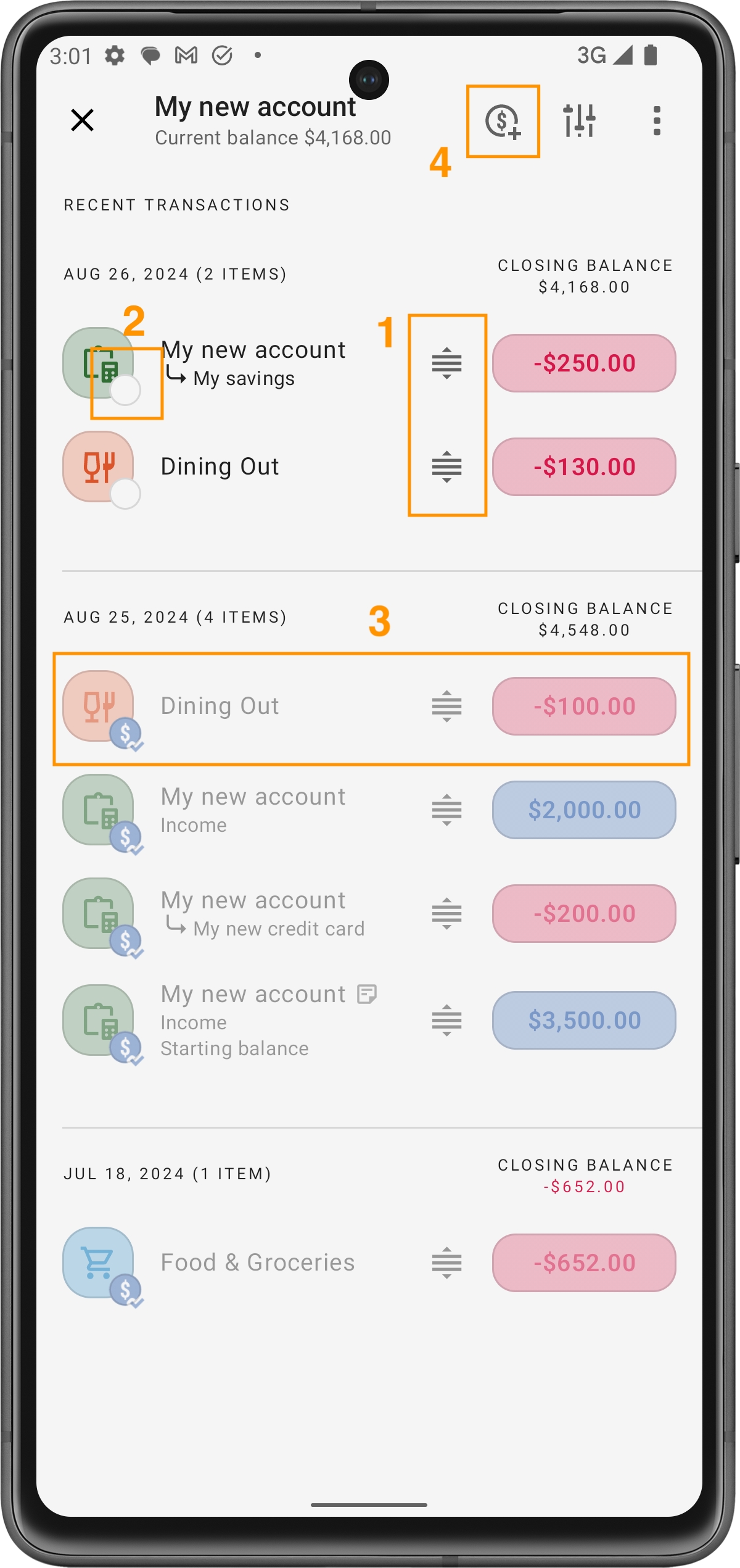Rapprochez régulièrement vos transactions pour que votre budget et les soldes réels de vos comptes restent synchronisés. Cela évitera toute divergence et garantira que vos données financières sont toujours à jour. Utilisez la fonctionnalité de glisser-déposer pour garder les transactions dans le bon ordre, rendant le processus de rapprochement plus fluide et intuitif.