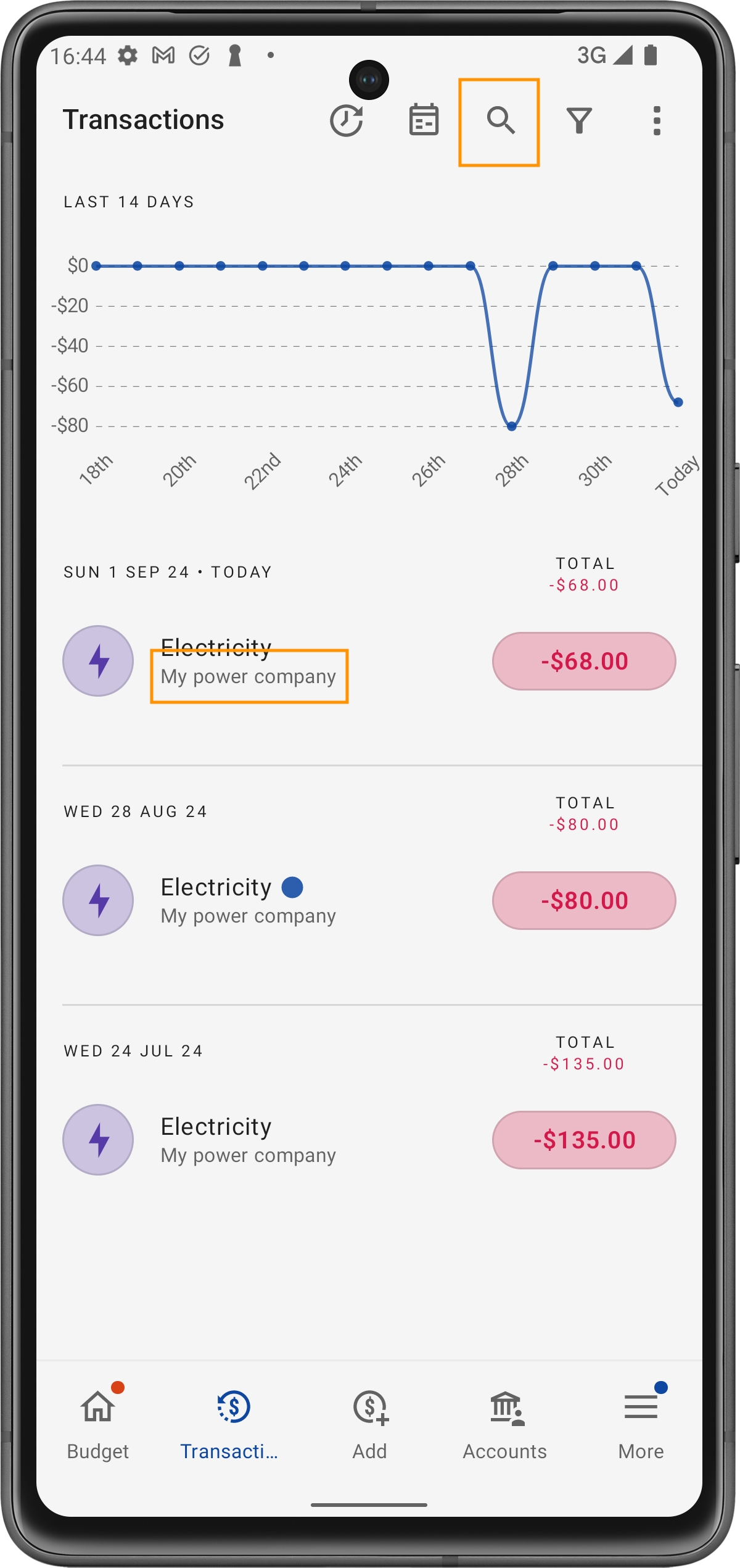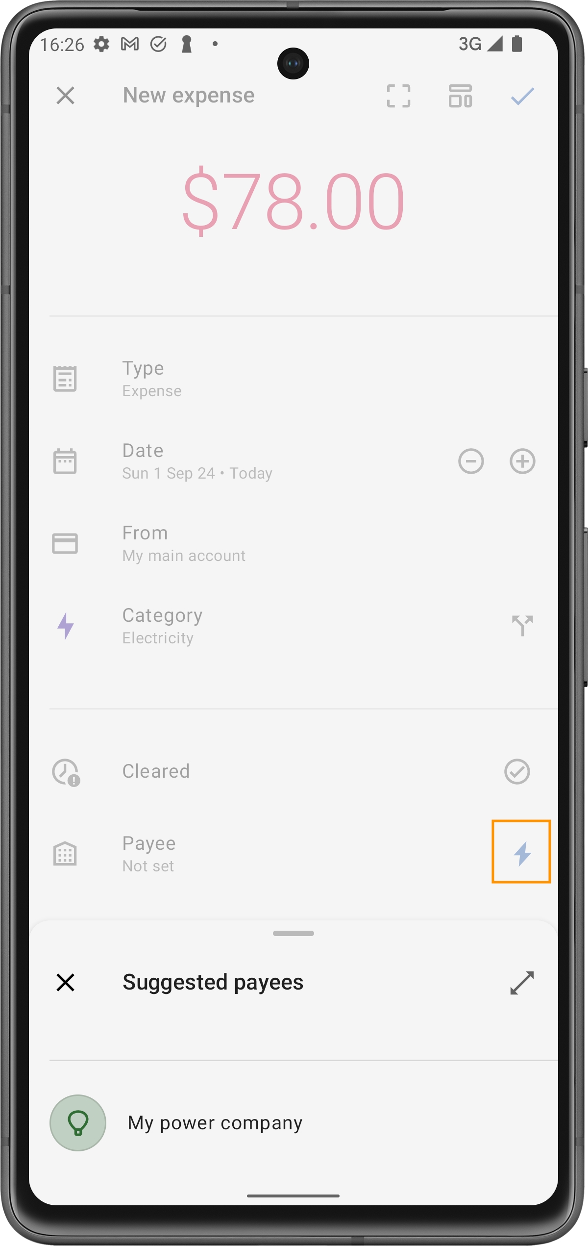 L'application dispose d'une fonctionnalité intelligente indiquée par l'icône éclair, qui représente la capacité d'auto-suggestion de l'application. Au fil du temps, l'application apprend vos modèles de dépenses, tels que les transactions fréquentes avec certains bénéficiaires, et les suggère automatiquement lorsque vous saisissez de nouvelles dépenses. Cela vous fait gagner du temps et simplifie le processus d'enregistrement des transactions. Par exemple, si vous payez régulièrement votre compagnie d'électricité, l'application commencera à suggérer "Ma compagnie d'électricité" à chaque fois que vous enregistrez une dépense liée à l'électricité.