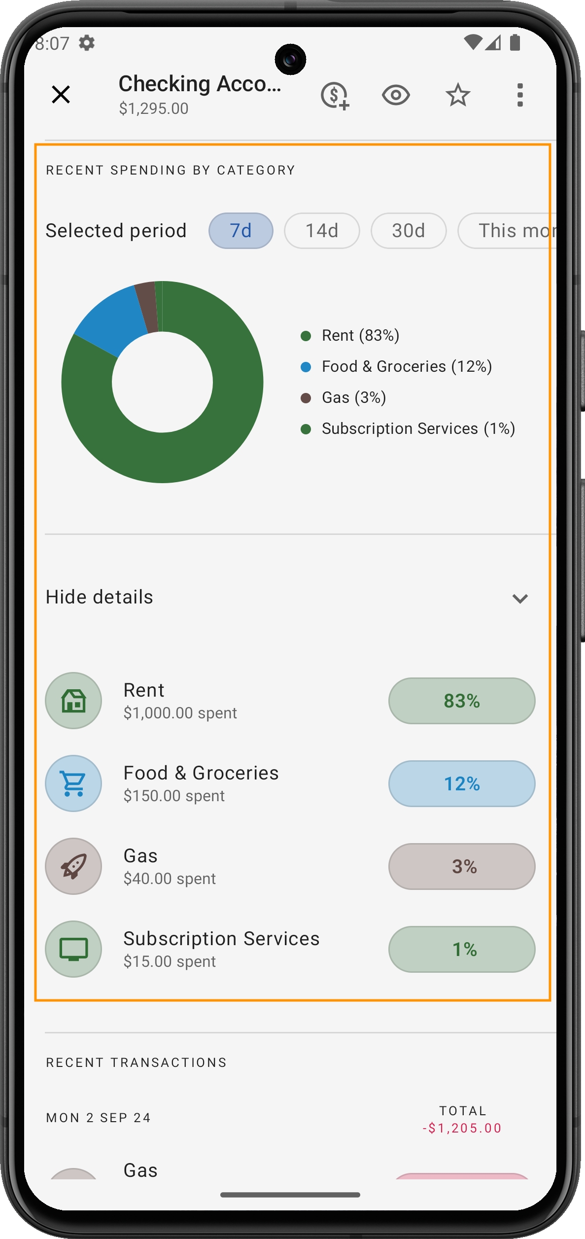La sezione Spese Recenti per Categoria fornisce un riepilogo visivo di come vengono spesi i tuoi soldi all'interno di un conto specifico, offrendo una suddivisione delle categorie e della rispettiva percentuale sul totale delle spese. Questa sezione ti aiuta a monitorare dove vanno i tuoi soldi e a fare eventuali aggiustamenti al tuo budget.