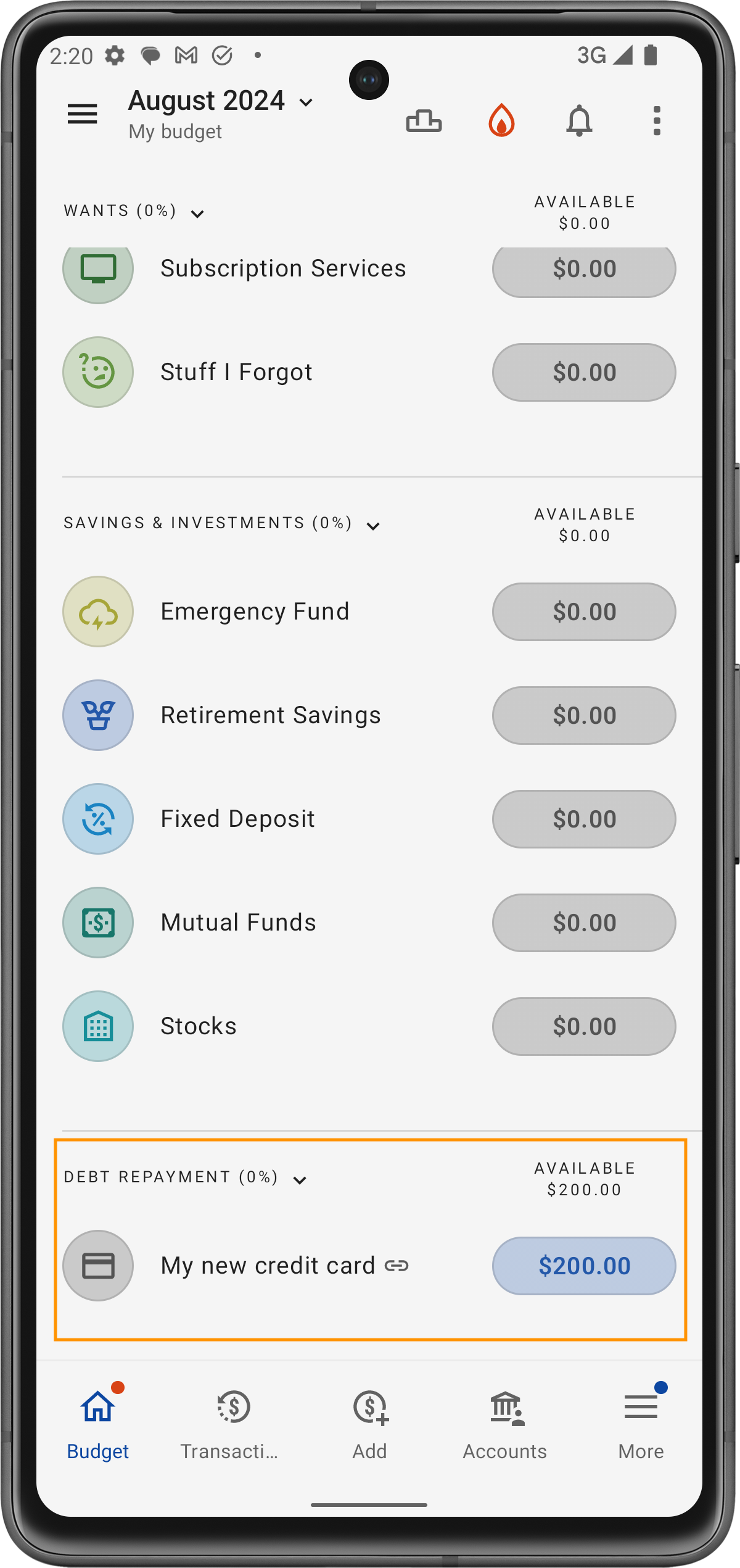 Dopo aver configurato il tuo account carta di credito, l'app creerà una categoria speciale specifica per i pagamenti della carta di credito. Tutte le spese effettuate con la carta passeranno dalle rispettive categorie a questa categoria fino a quando la carta non sarà rimborsata.