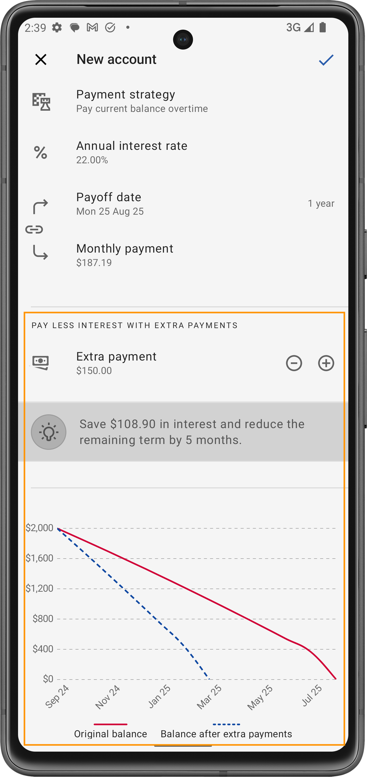 Per chi ha bisogno di distribuire i pagamenti della carta di credito, questa opzione imposta un obiettivo mensile per ridurre gradualmente il saldo. Puoi simulare diversi scenari di rimborso utilizzando il Calcolatore del Debito integrato nell'app.