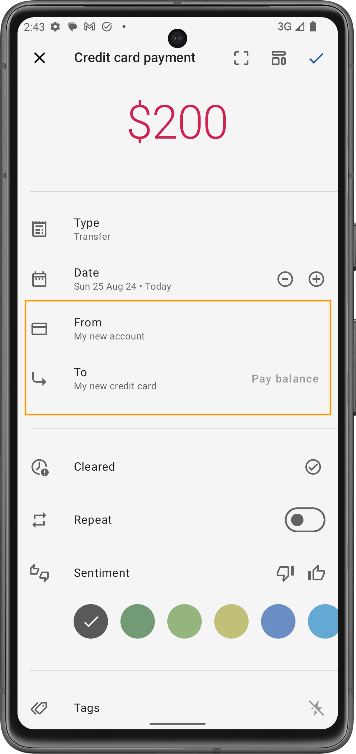 Paga l'importo totale: L'app presumerà che tu abbia i fondi disponibili e assegnerà automaticamente il denaro per pagare il saldo della carta alla fine del periodo di rendicontazione.