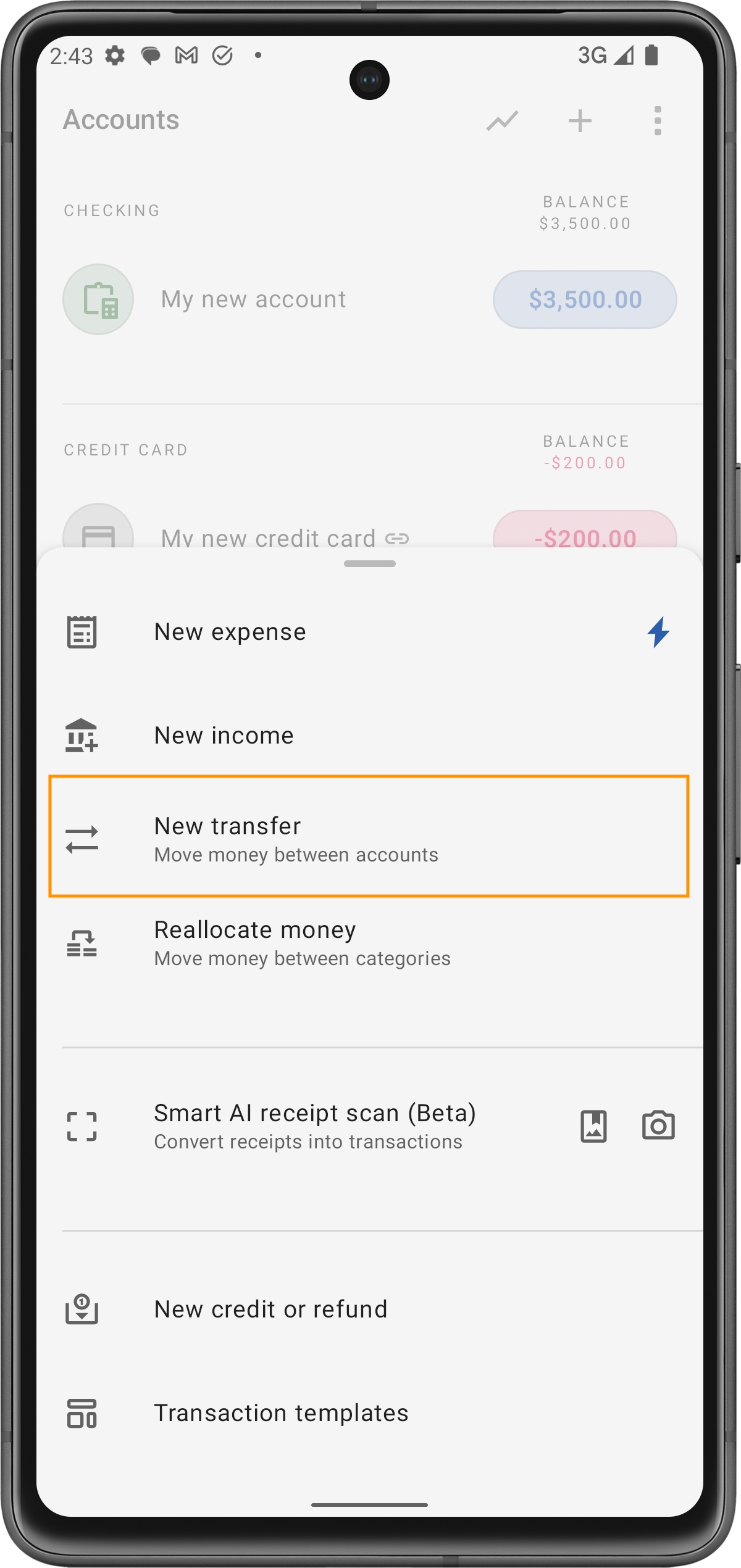 Tocca Trasferisci e scegli il conto della carta di credito come destinazione.