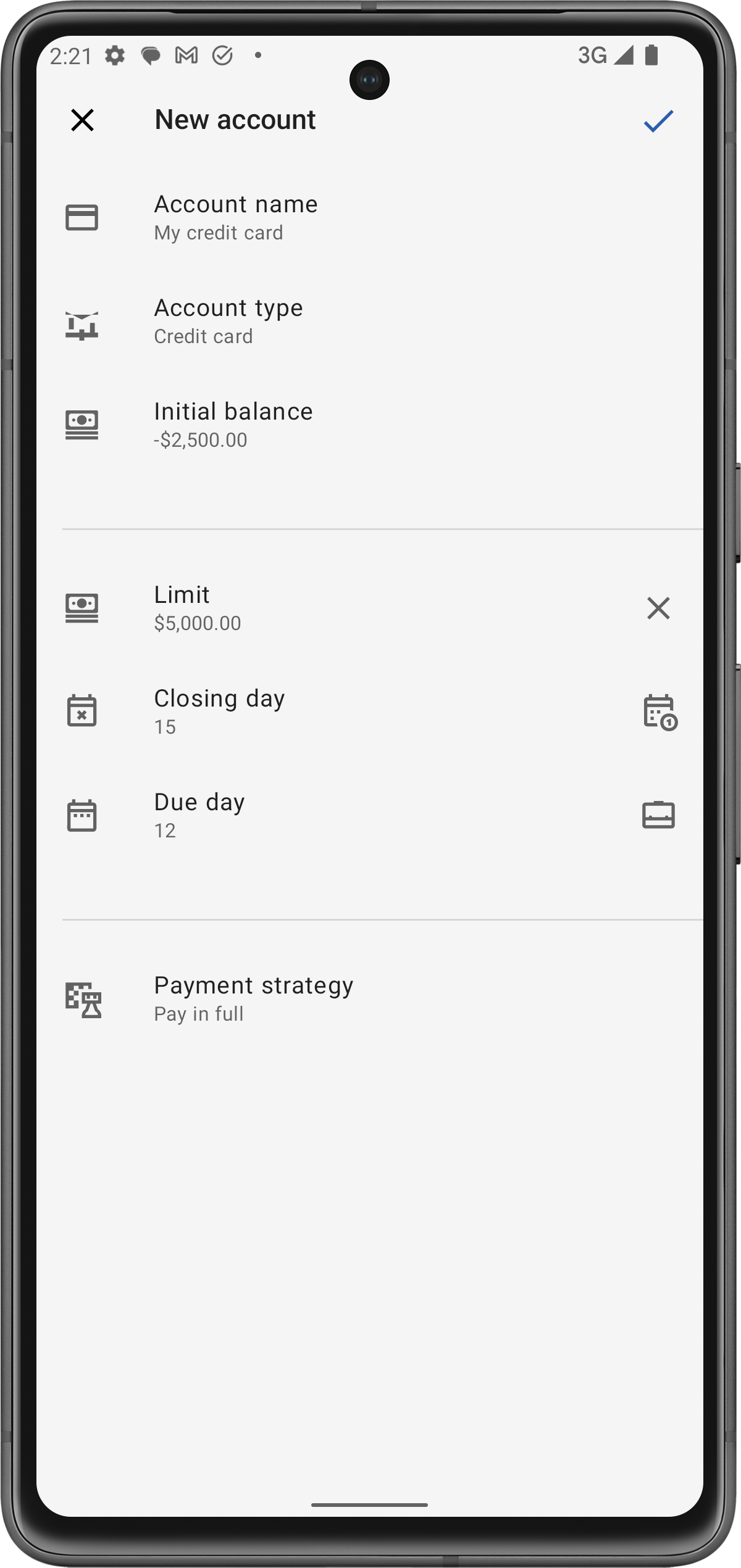 Inserisci il saldo e i dettagli: Inserisci il saldo attuale (solitamente un numero negativo, che rappresenta il debito dovuto). Puoi anche impostare campi opzionali come limite di credito, data di scadenza e giorno di chiusura, che aiuteranno l'app a gestire i tuoi rimborsi.