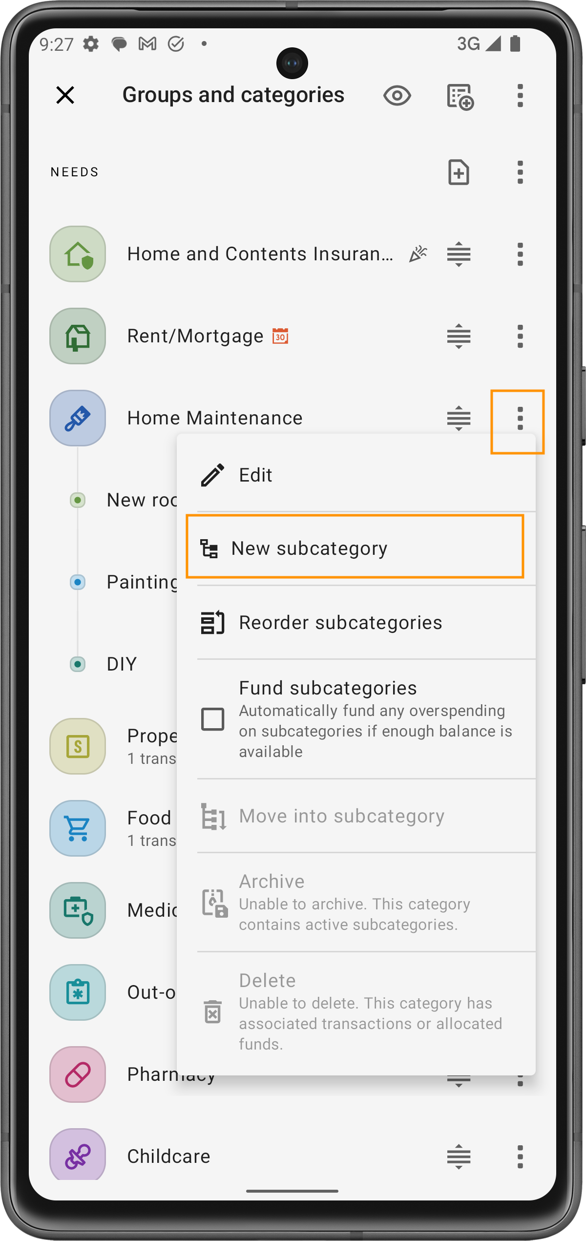 Per abilitare questa funzione, vai alle impostazioni della categoria principale e seleziona 'Finanzia sottocategorie'. Questa impostazione consente all'app di regolare automaticamente le allocazioni all'interno delle sottocategorie ogni volta che spendi da esse, assicurandoti che il budget totale della categoria principale venga utilizzato in modo ottimale.