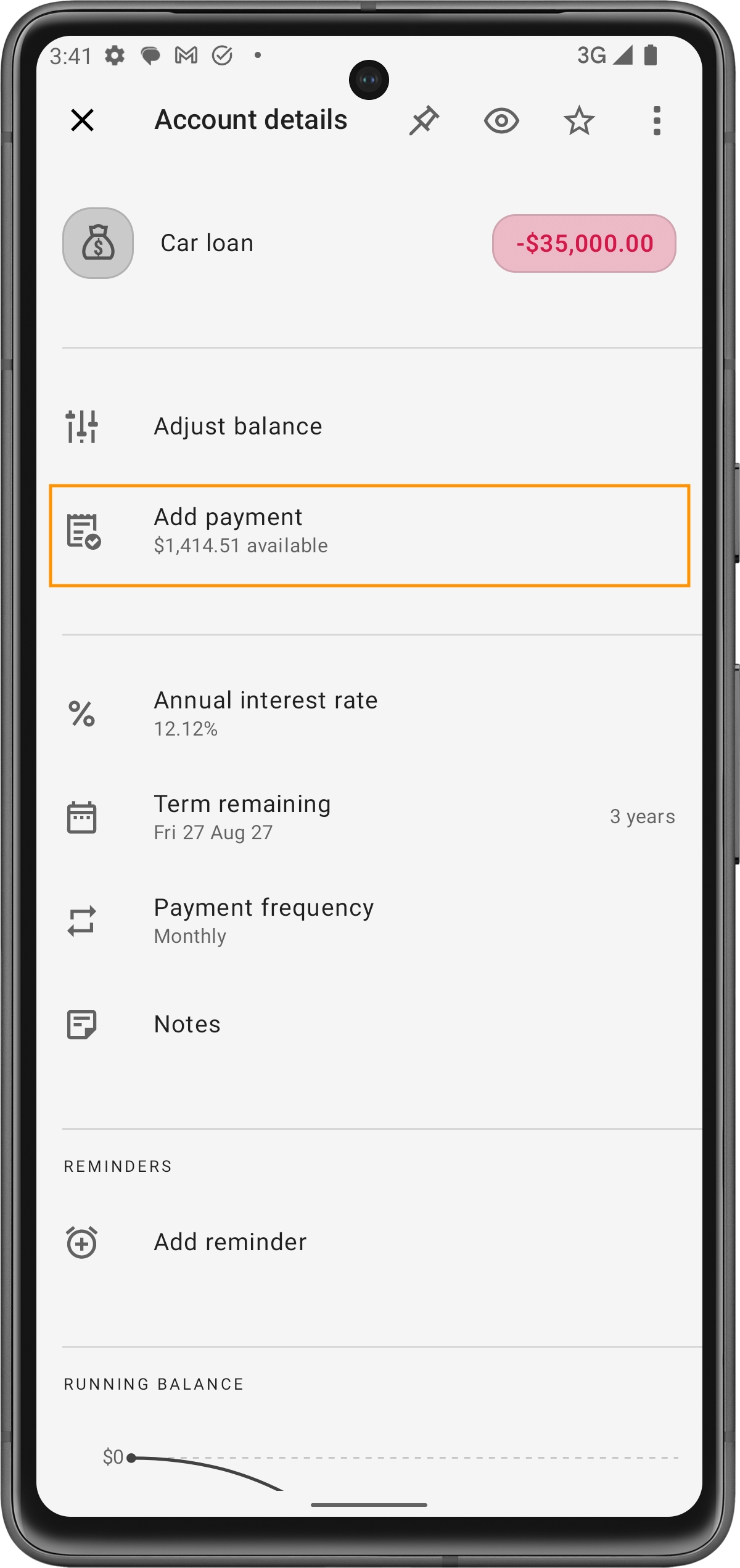 Effettuare un Pagamento: Quando sei pronto a pagare, accedi al tuo account di prestito. Potrai aggiungere i dettagli del pagamento, inclusi capitale, interessi e eventuali commissioni associate al pagamento mensile. Una volta confermato, l'importo verrà detratto dalla categoria collegata al prestito, mantenendo il tuo budget sincronizzato.