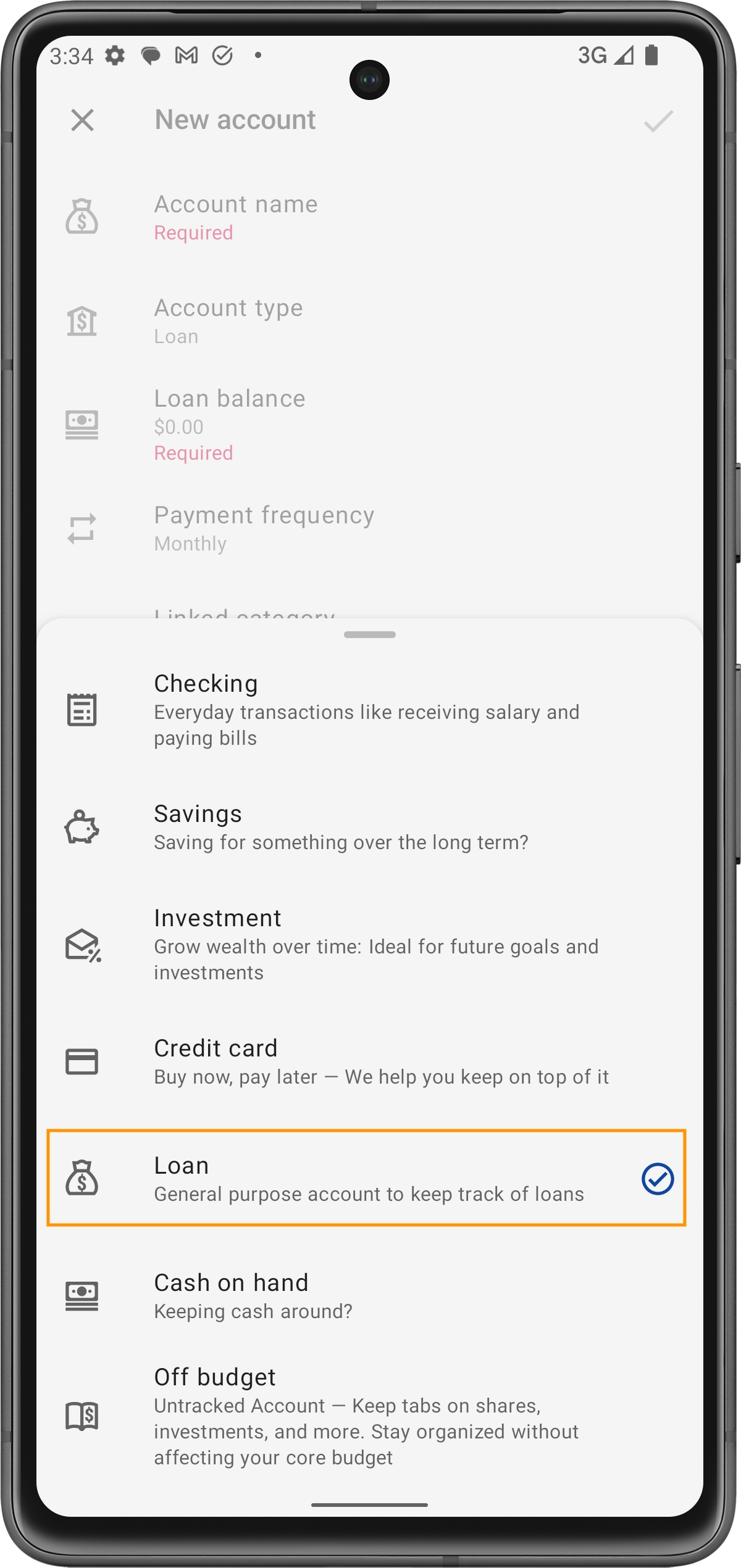 Tipo di Account: Seleziona Prestito come tipo di account. Questo distingue il prestito da altri tipi di account come conti correnti, di risparmio o di carte di credito.