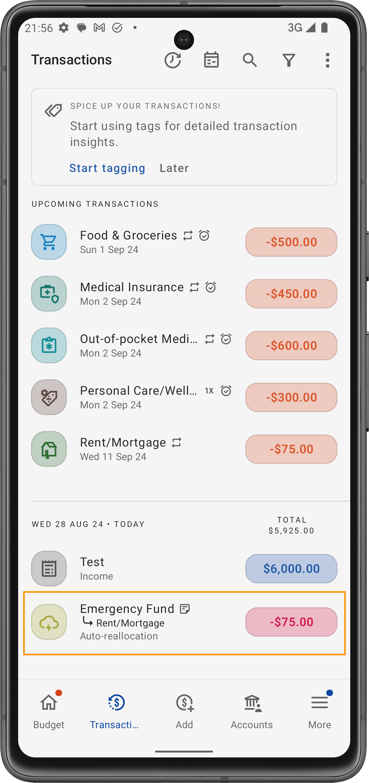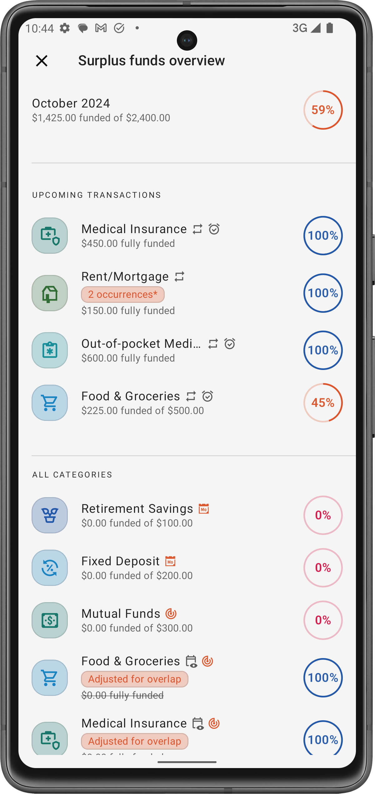 Uno dei benefici immediati del designare un Fondo in Surplus è la capacità dell'app di coprire automaticamente qualsiasi eccesso di spesa in altre categorie. Ecco come funziona: