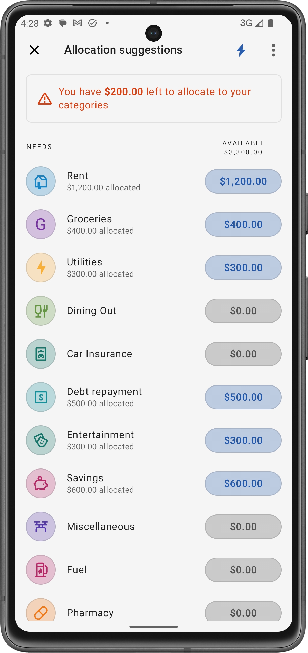 Facilità di Configurazione: Gli utenti devono semplicemente inserire il loro reddito previsto e allocarlo alle categorie di spesa.