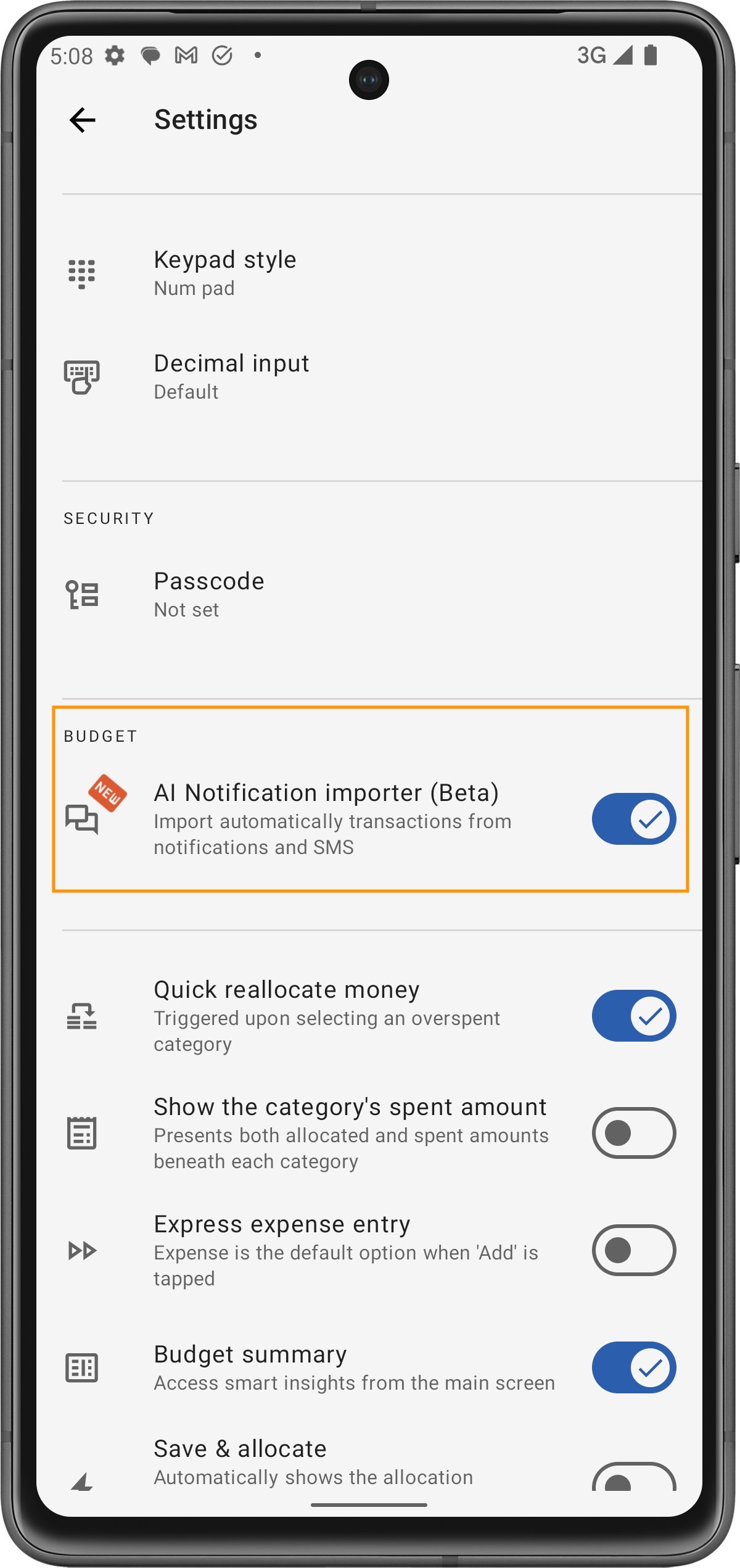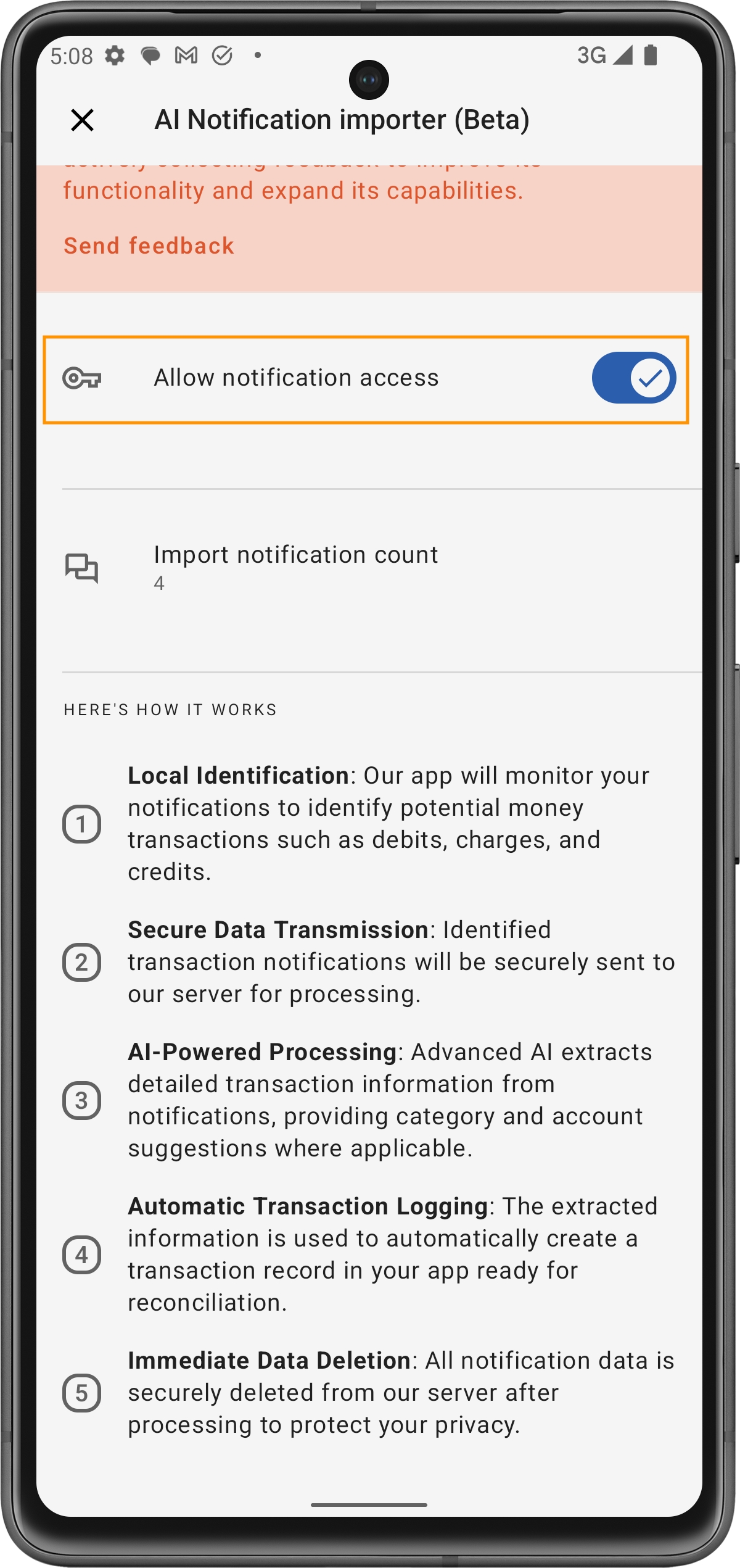 La funzionalità AI Notification Importer è uno degli strumenti più potenti nel tuo arsenale di budgeting, offrendo un approccio senza mani per registrare le transazioni. Abilitando l'accesso alle notifiche, l'app monitora le tue notifiche in arrivo per rilevare transazioni finanziarie come addebiti, accrediti, pagamenti e acquisti. È progettata per acquisire e processare in modo sicuro queste informazioni, convertendole automaticamente in transazioni all'interno dell'app—risparmiandoti tempo e fatica.