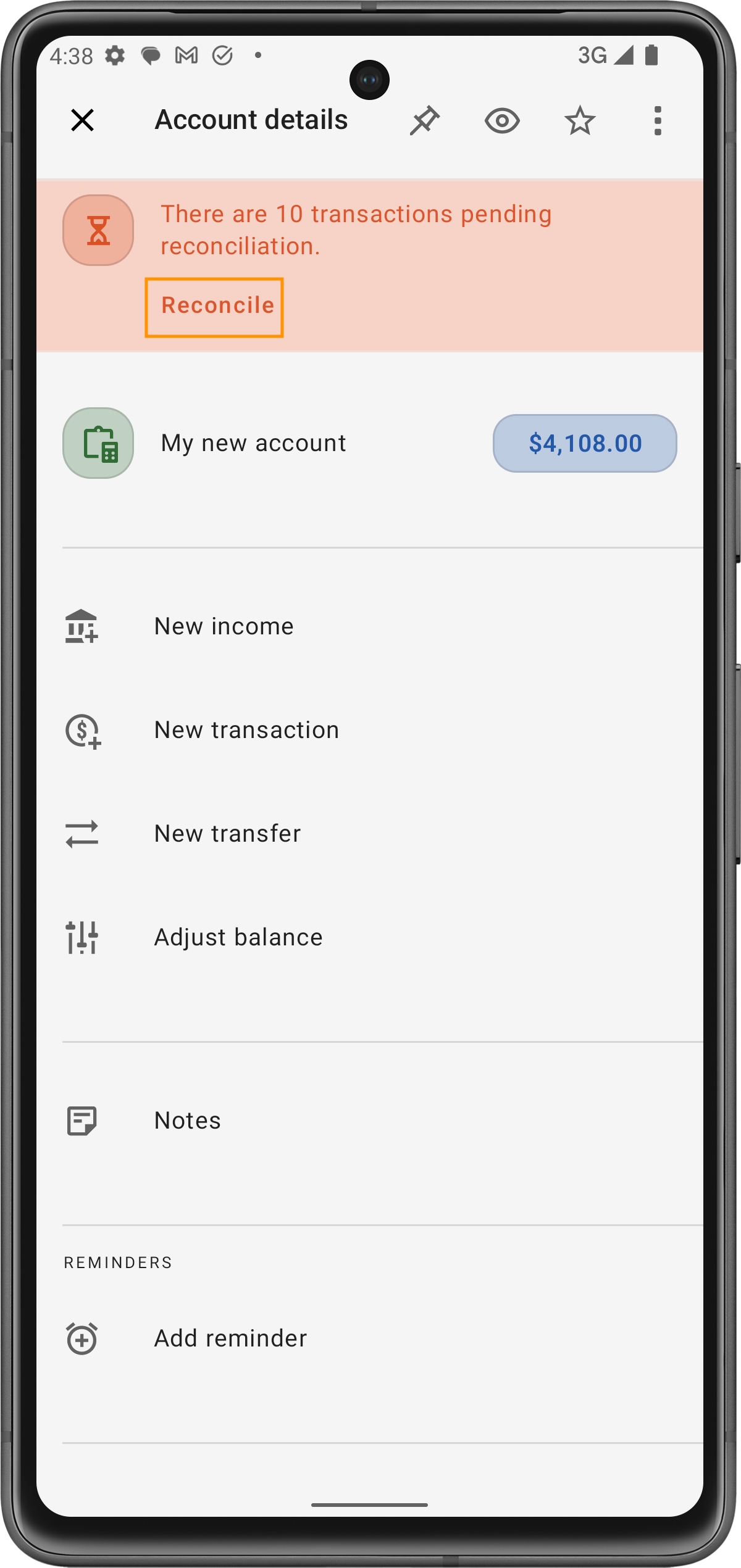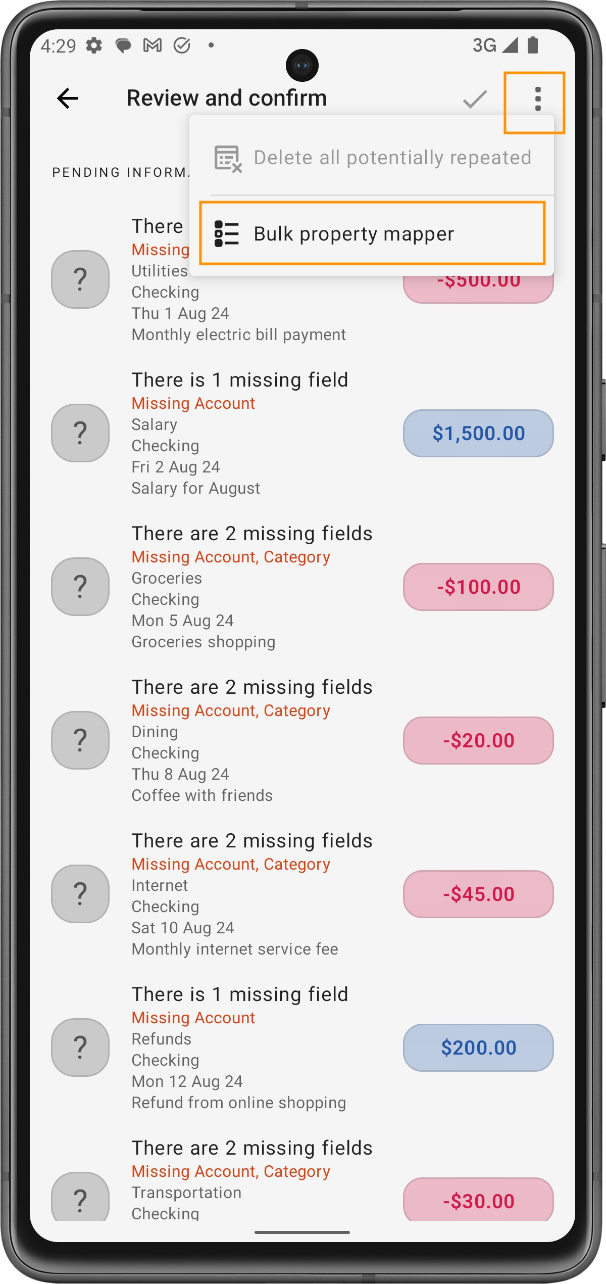Dopo aver importato il file CSV, l'app elencherà tutte le transazioni in attesa di riconciliazione. Queste includono transazioni in attesa della tua revisione e potenziali transazioni ripetute. Puoi riconciliarle come faresti dopo aver importato file OFX. Questo passaggio garantisce che tutte le transazioni siano correttamente allineate con i tuoi estratti conto bancari, aiutandoti a mantenere registri finanziari accurati.