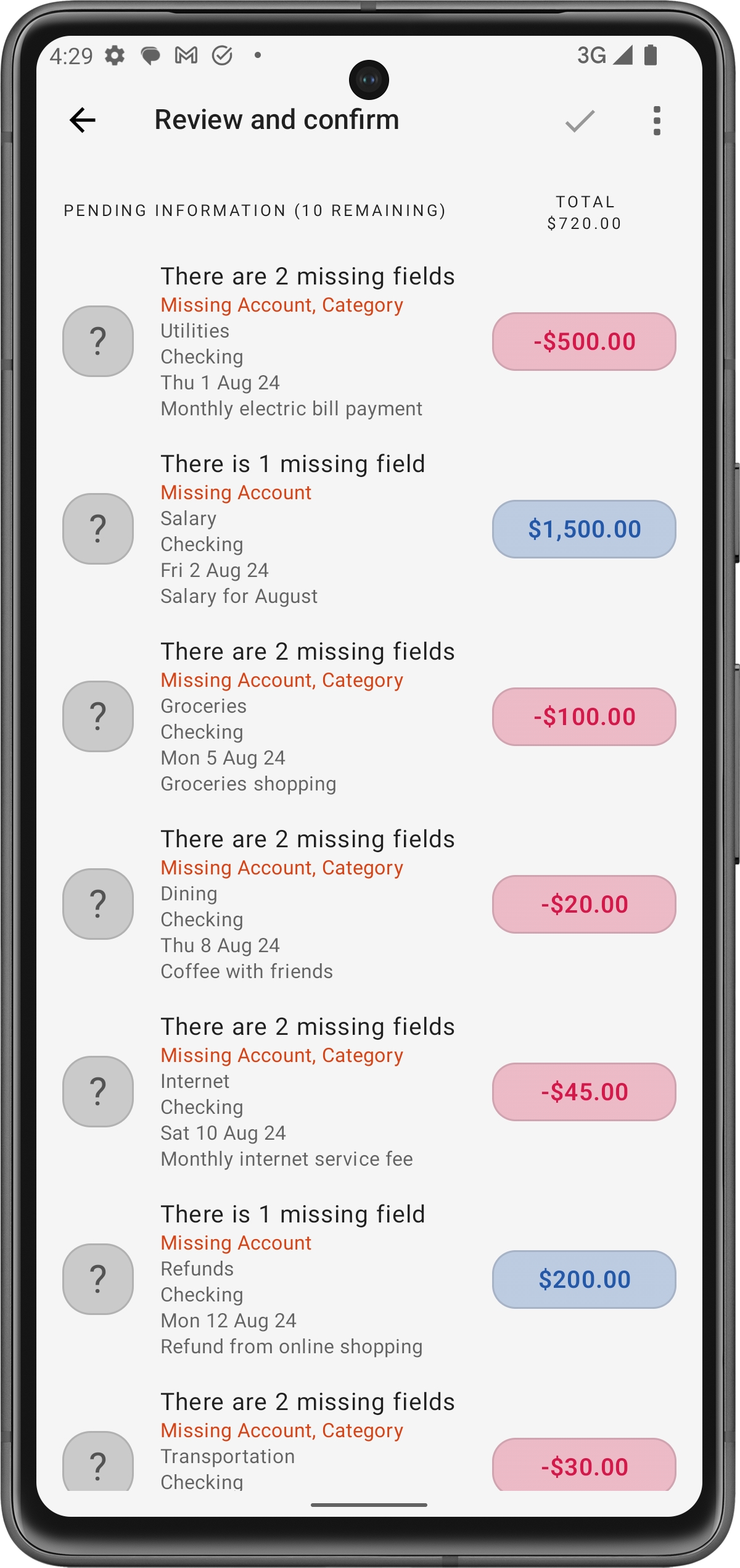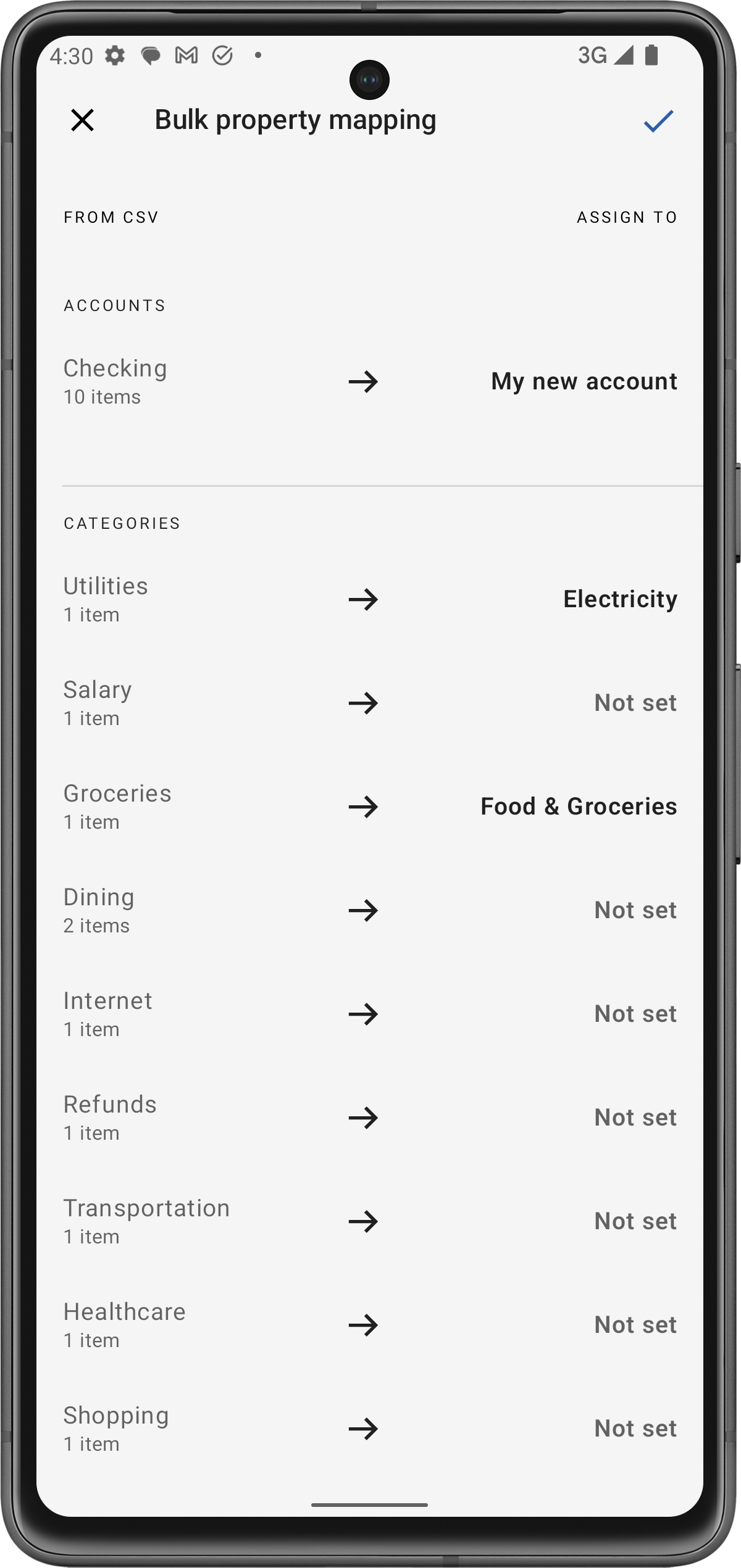 Una volta soddisfatto delle mappature, conferma l'importazione cliccando sul segno di spunta. Le tue transazioni verranno aggiunte all'app.