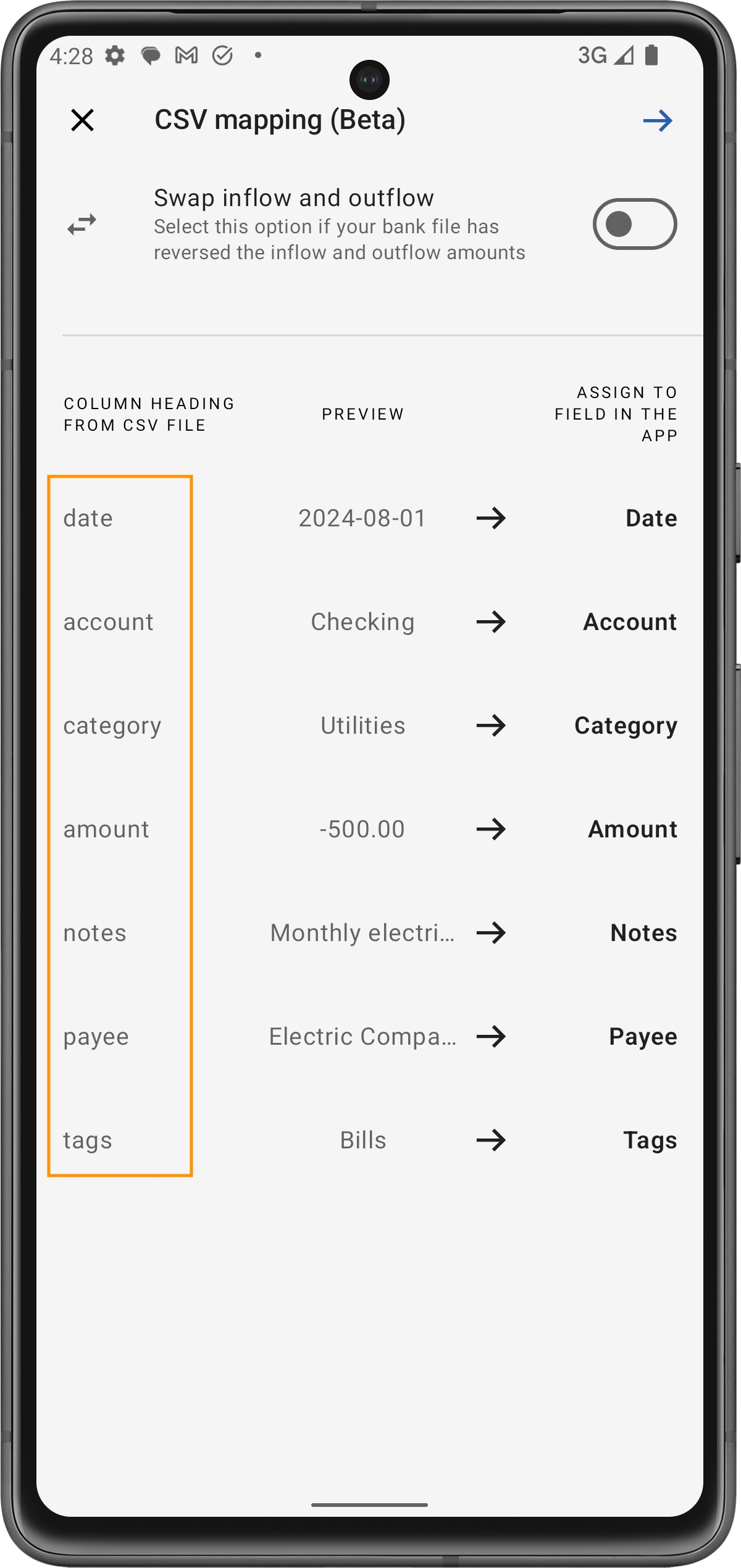 La funzione di anteprima mostra come le colonne del tuo file CSV verranno mappate ai campi dell'app, dandoti la possibilità di apportare modifiche se necessario.