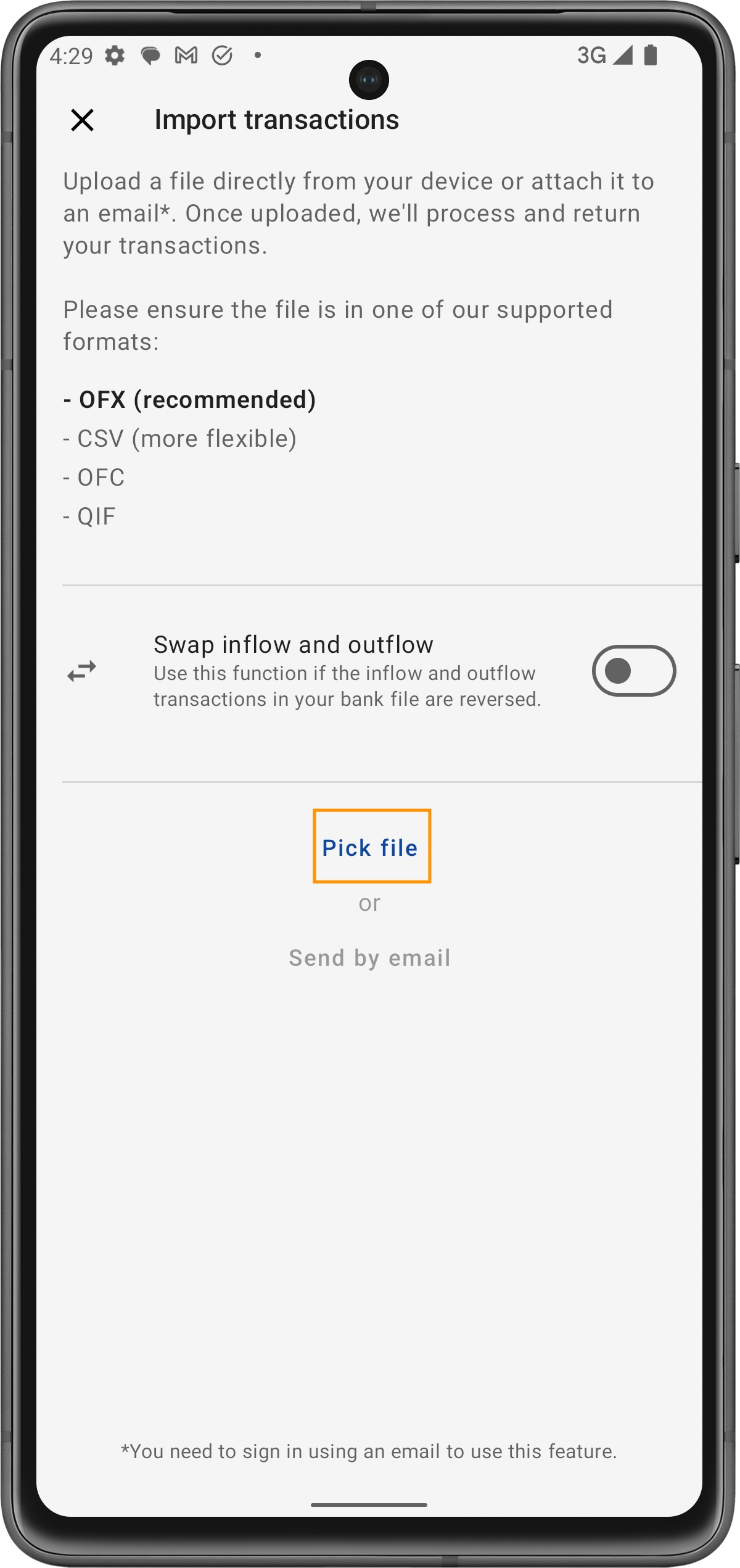 Fai clic su Scegli file per caricare il file CSV dal tuo dispositivo oppure scegli l'opzione Invia via email. Assicurati che il file segua il formato corretto per un'importazione senza problemi.