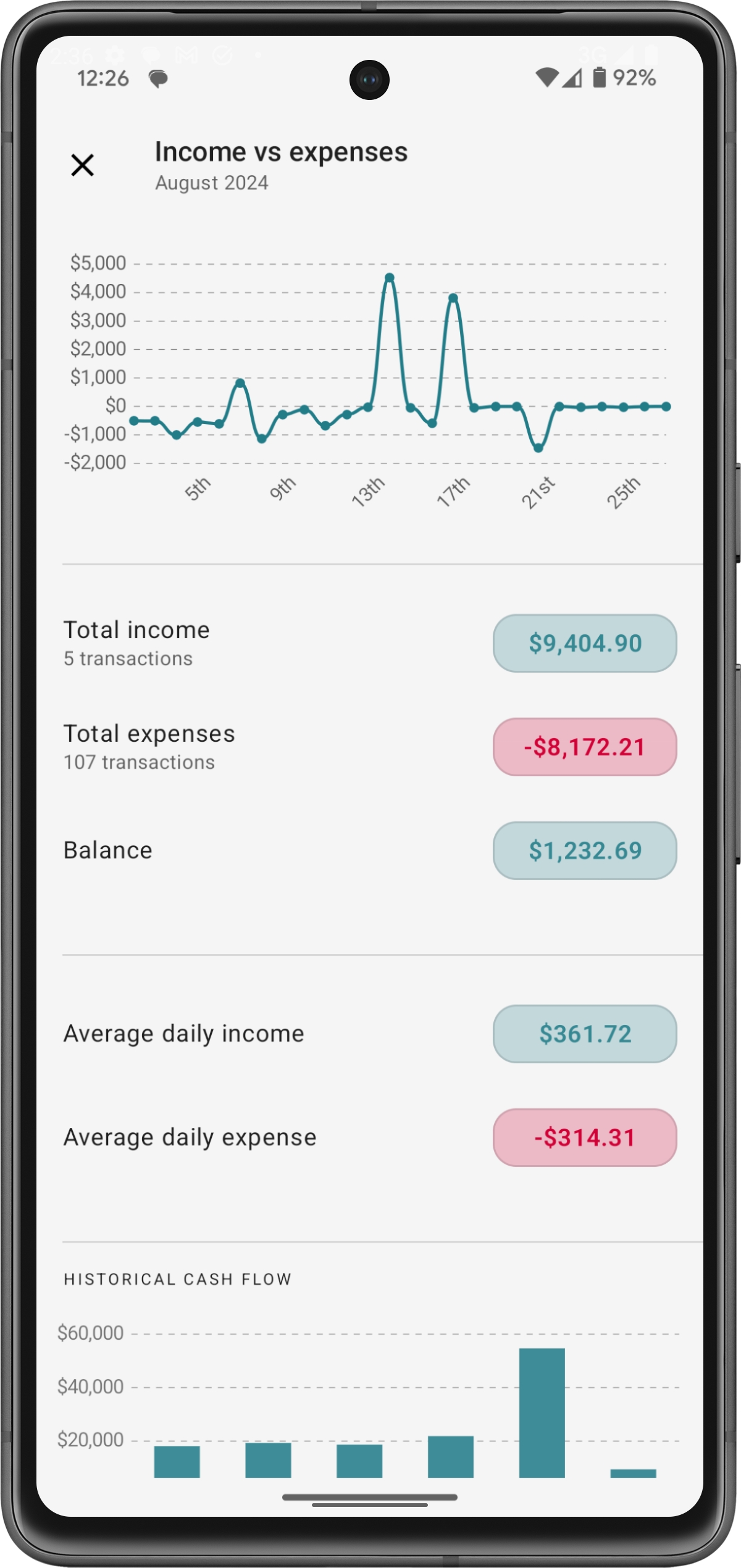 Panoramica grafica: Il grafico in alto visualizza la tua attività di reddito e spese nel tempo, mostrando picchi e cali nel tuo flusso di cassa. Questo ti aiuta a individuare rapidamente i giorni in cui il tuo reddito è aumentato o le tue spese sono state più alte del solito, facilitando l'identificazione dei modelli di spesa.