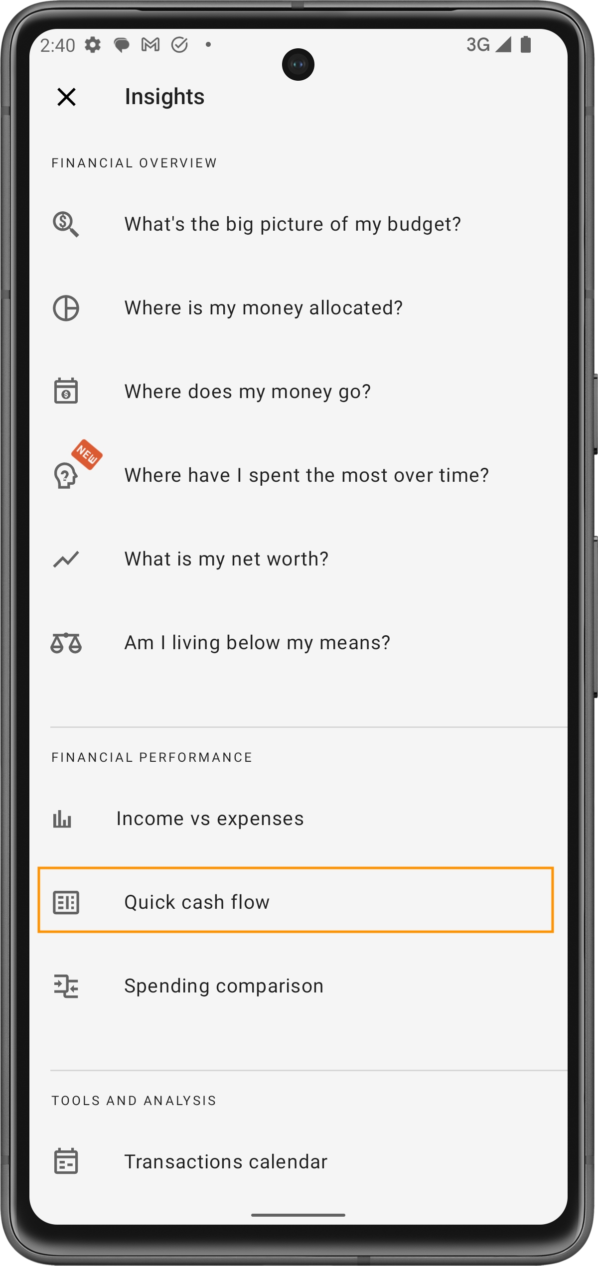 Utilizzando l'insight Cash Flow Rapido, puoi valutare facilmente come stai gestendo i tuoi soldi su periodi brevi e agili, aiutandoti a prendere decisioni più informate per mantenere o migliorare il tuo equilibrio finanziario.